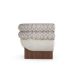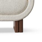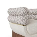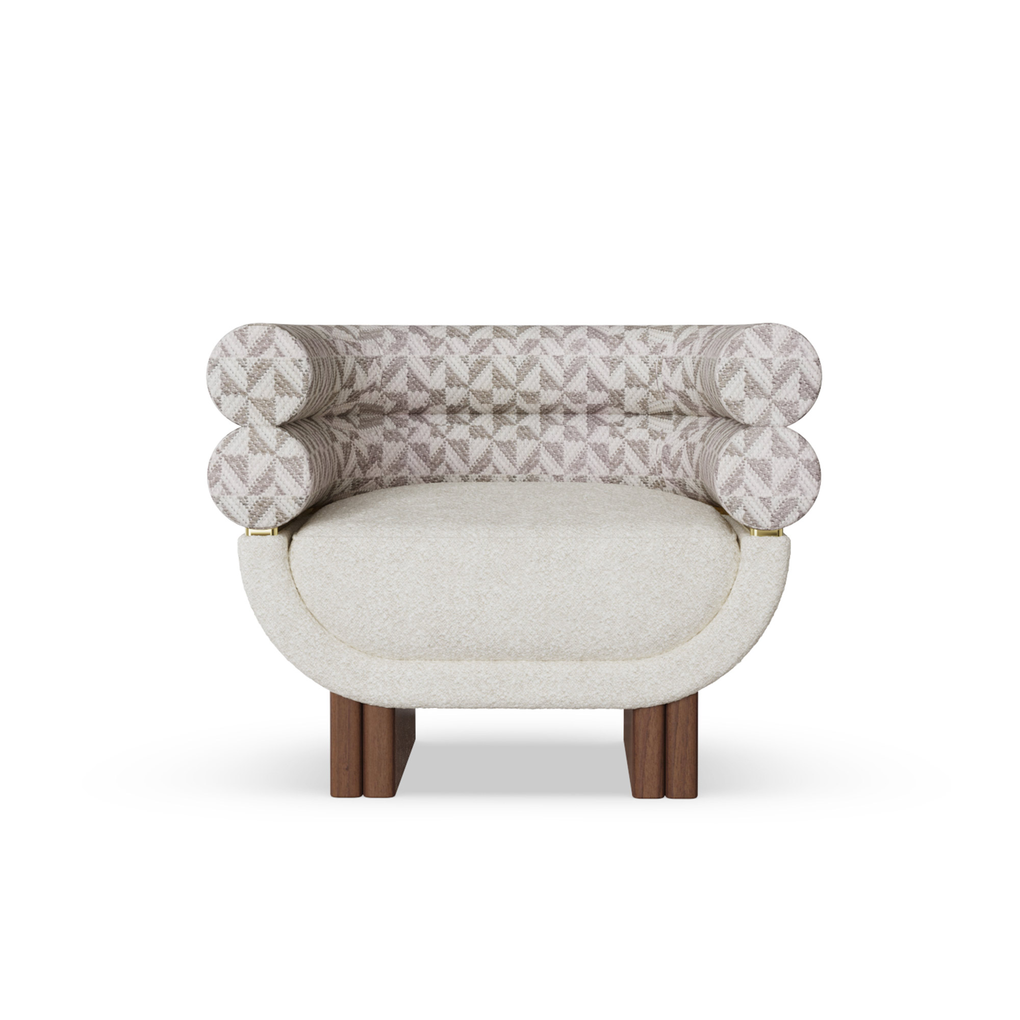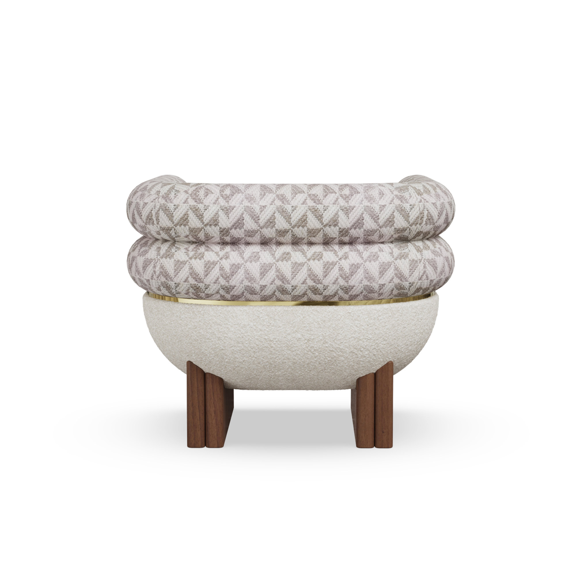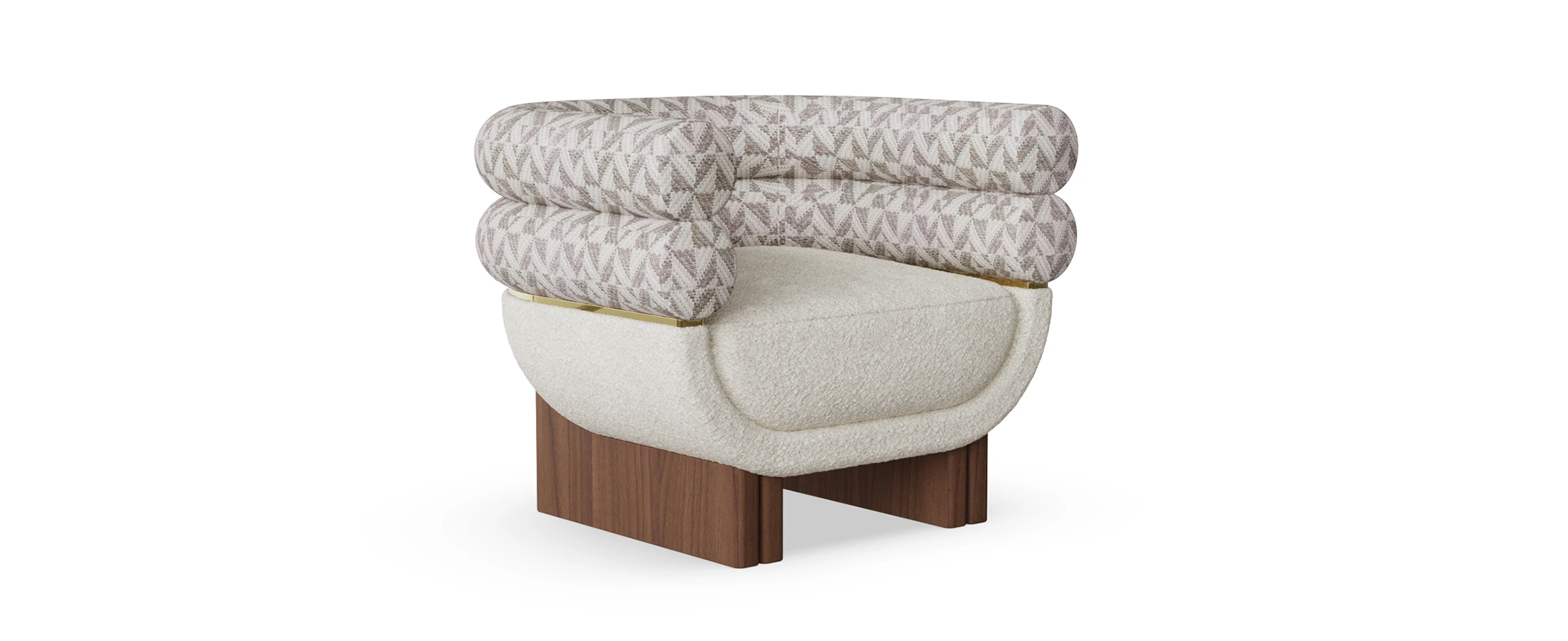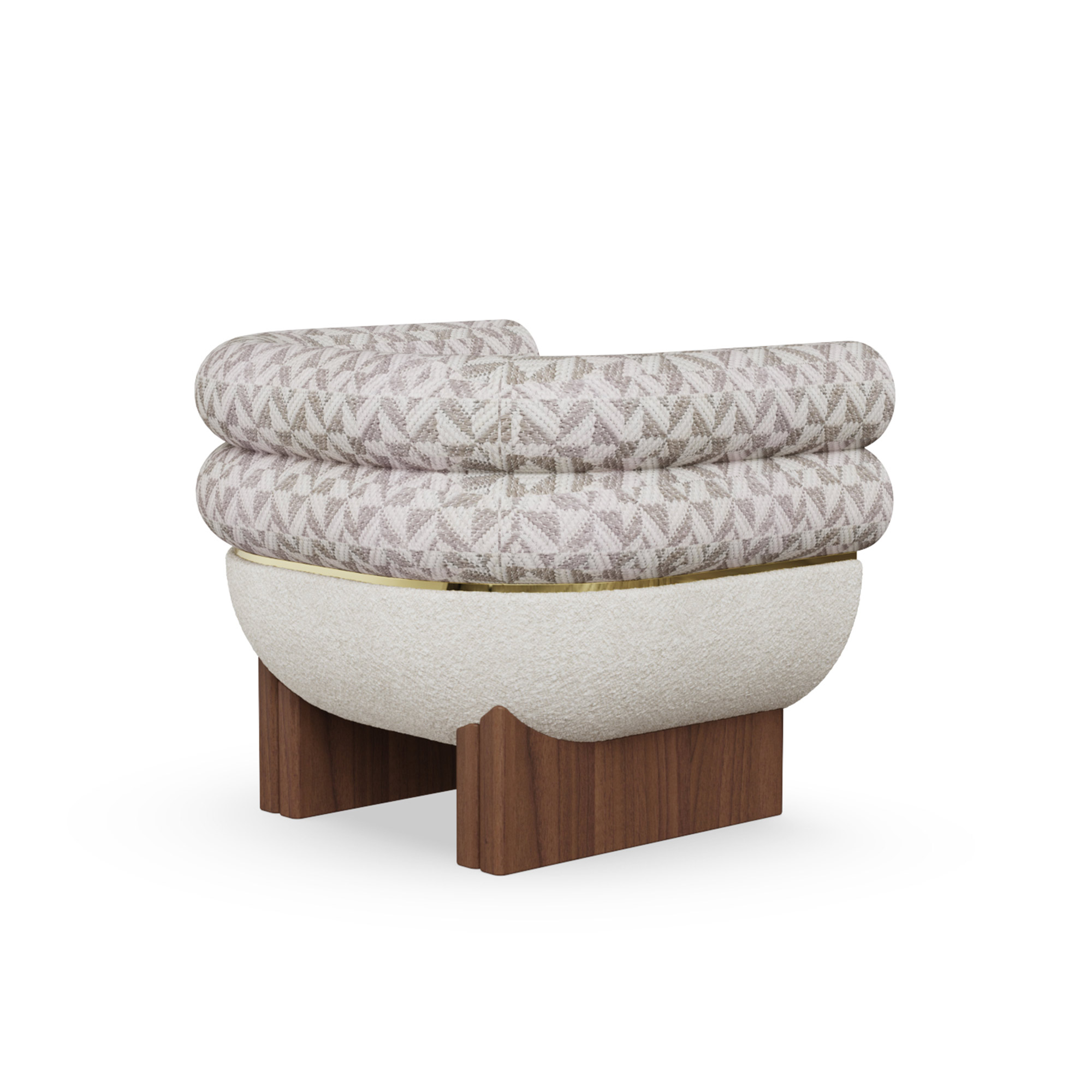 The lower shell is wrapped in textural bouclé; the upper cushions are tailored in a complementary weave for layered tactility. A slender brass band articulates the meeting line between volumes and rests on solid walnut legs that ground the form without visual weight. Upholstery lines are crisp, controlled, and every junction feels deliberate.