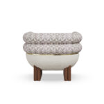 The double-roll backrest is upholstered in textured Elitis fabric, bringing a sculptural softness and visual rhythm to the form.