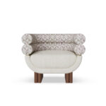 Amélie is a luxury bouclé armchair with a poised, sculptural silhouette. The double-roll back gathers into soft, continuous curves that read elegant from every angle, while the compact footprint keeps arrangements calm and composed.