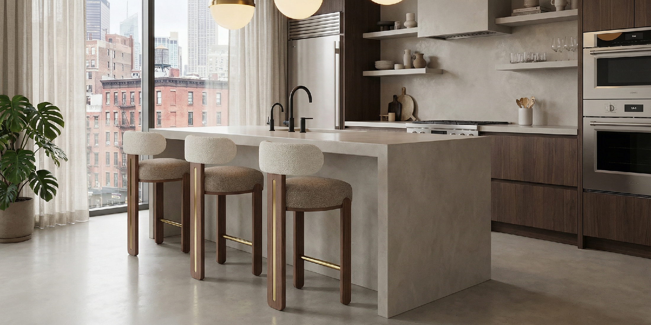 Elegance elevated — the Diane Bar Chair brings soft bouclé, warm walnut, and timeless comfort to any kitchen or bar space.