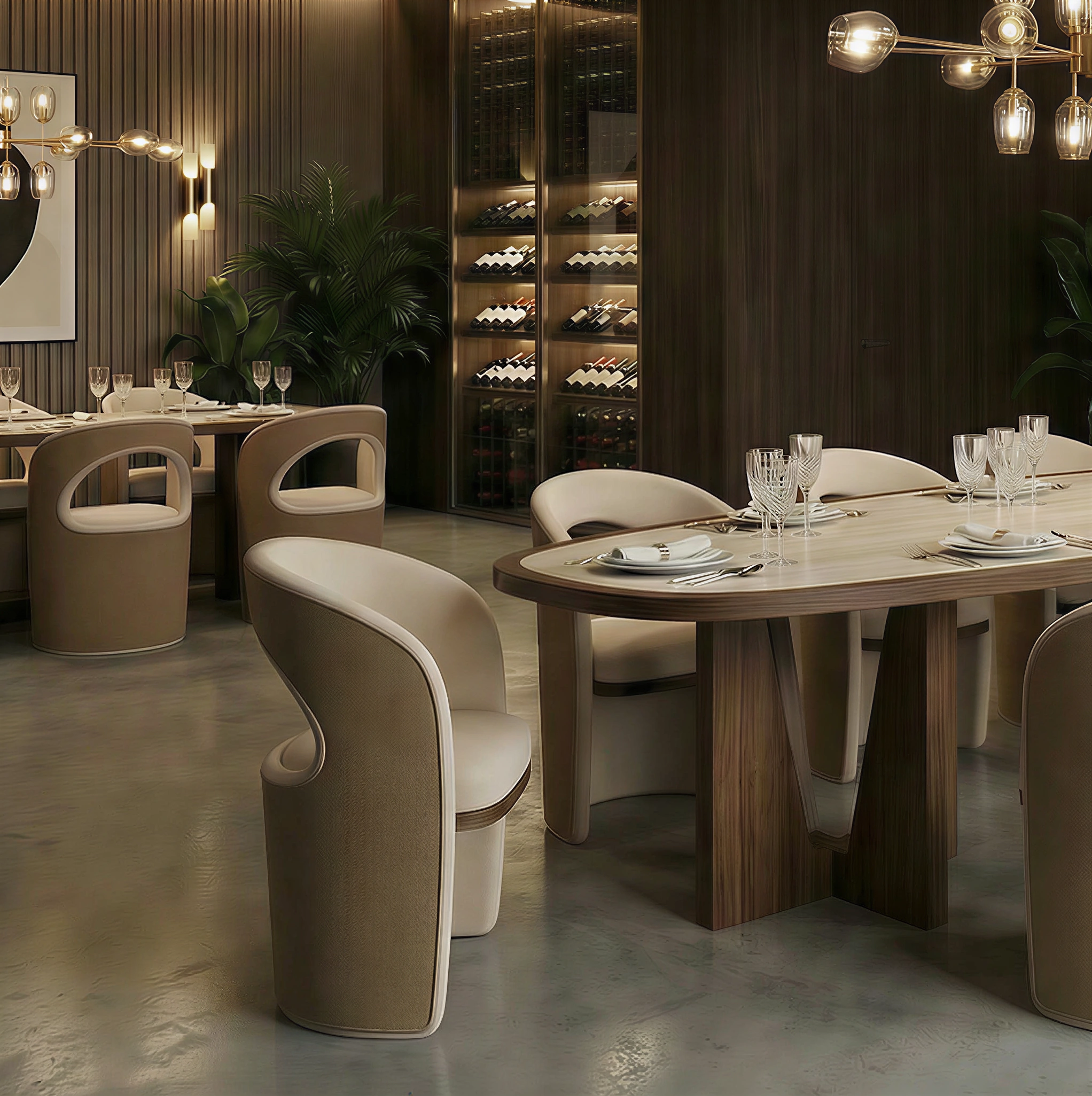 Berta is a high-end velvet dining chair composed with a calm, architectural sweep. The wraparound back carves into an open oval, holding the body without bulk and keeping the silhouette grounded around the table.