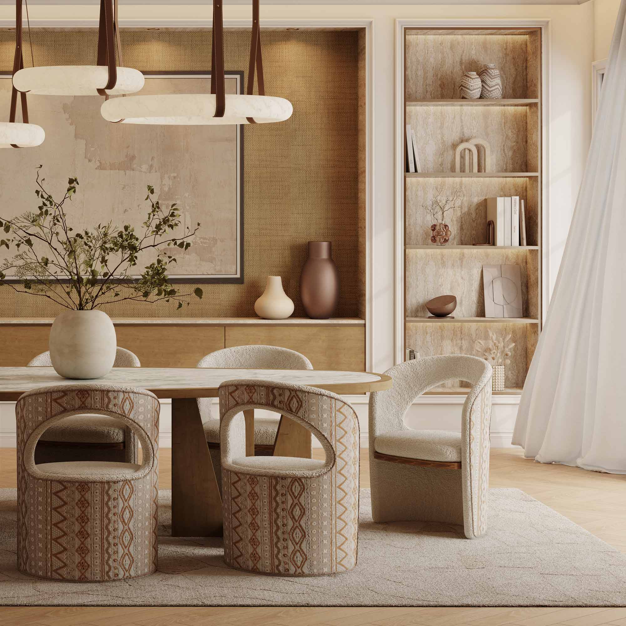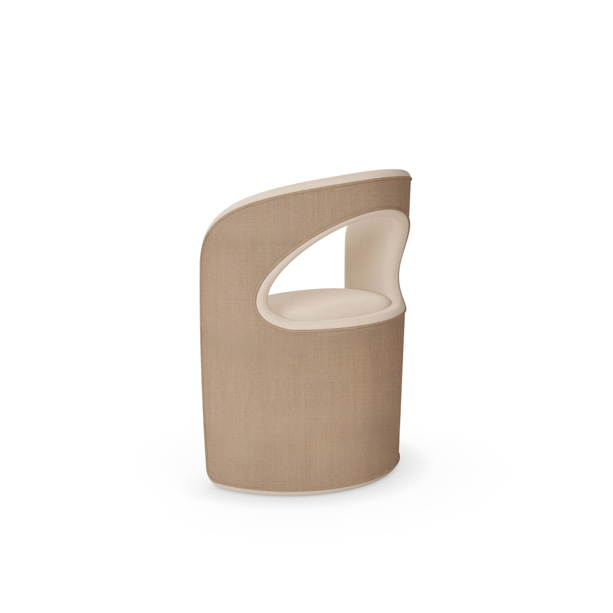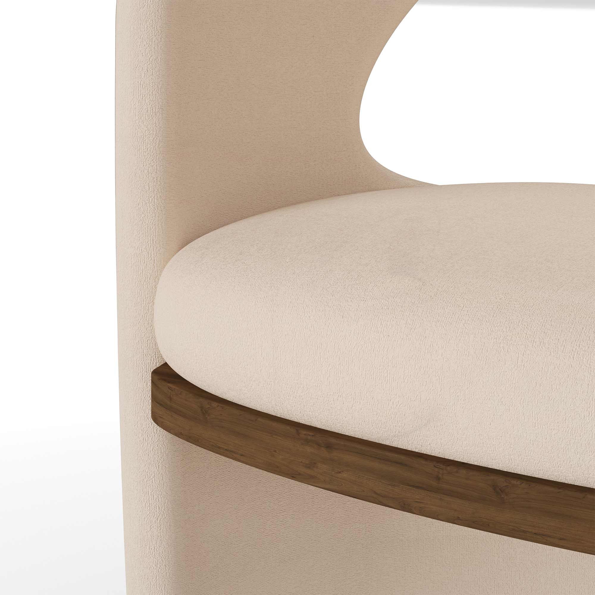 The Berta Dining Chair by Nolita Harbour blends elegance and modern sophistication, featuring refined linen upholstery, a curved open-back design for comfort, and a striking walnut accent for a luxurious touch.
