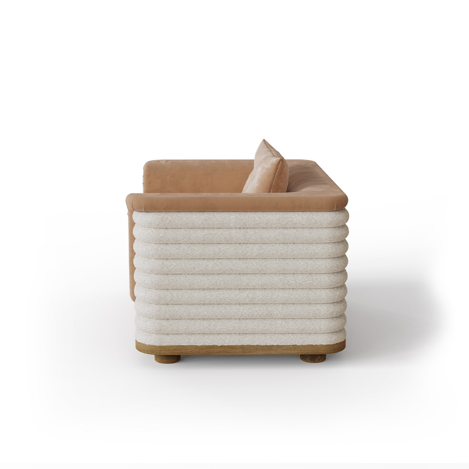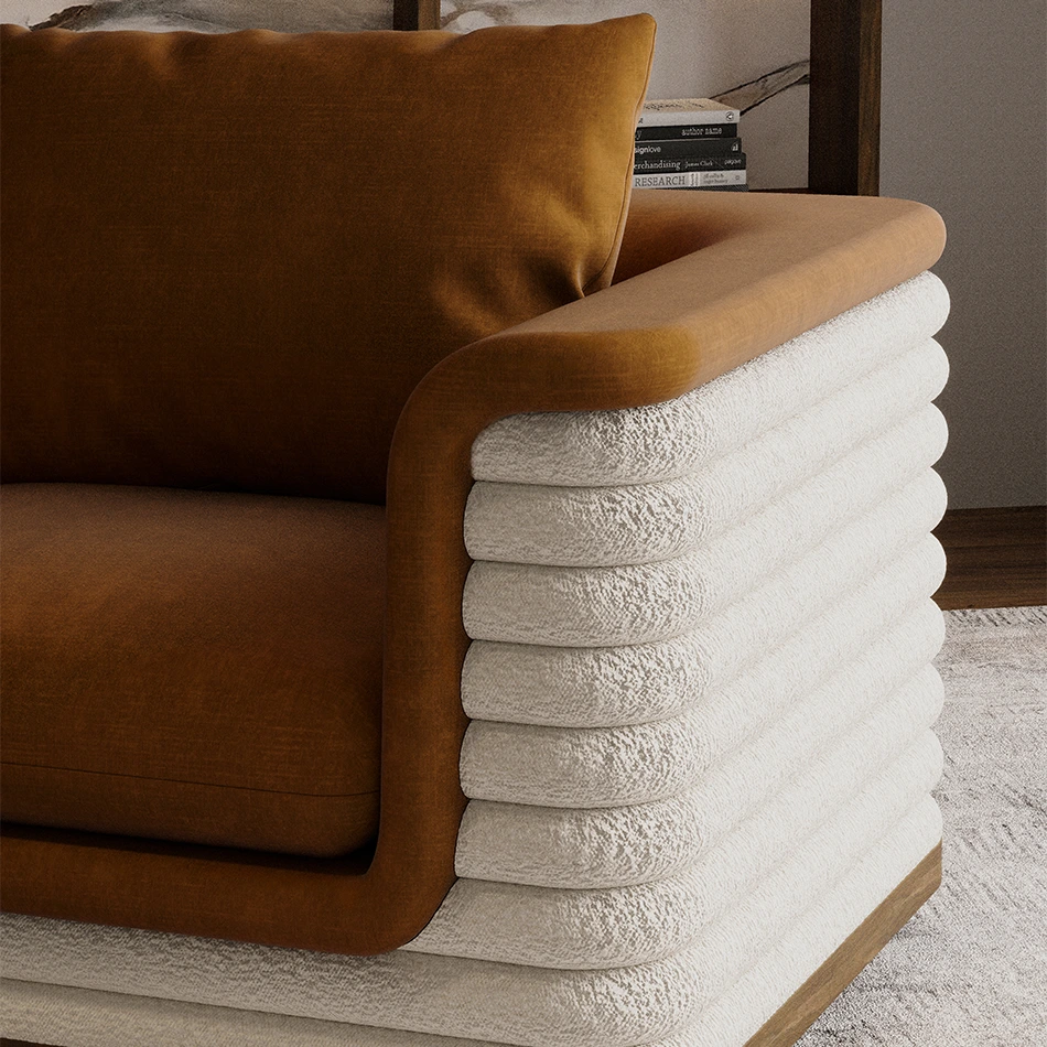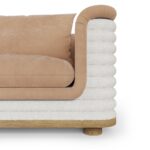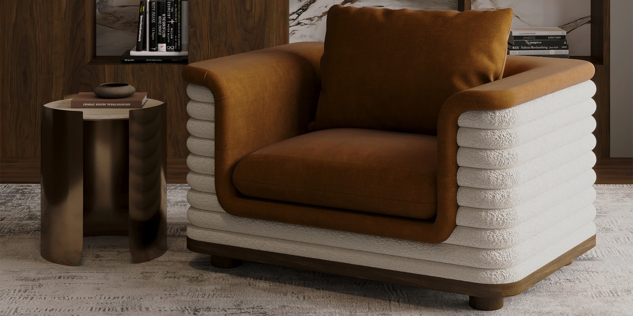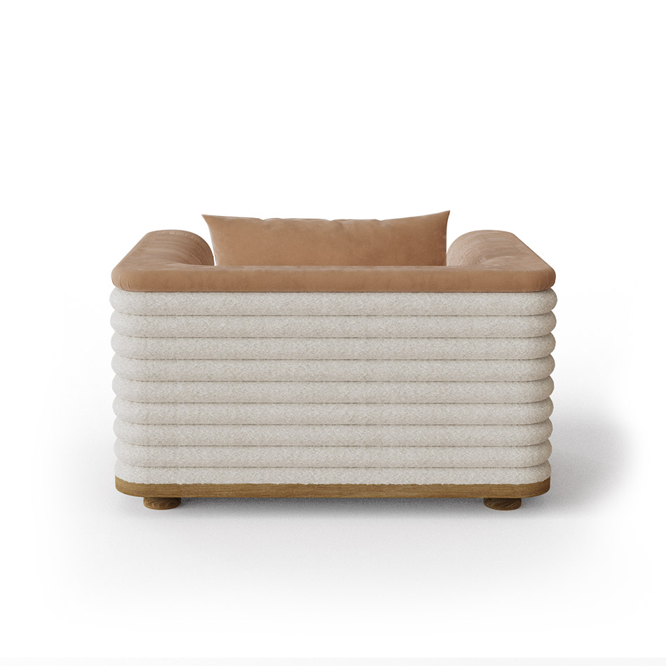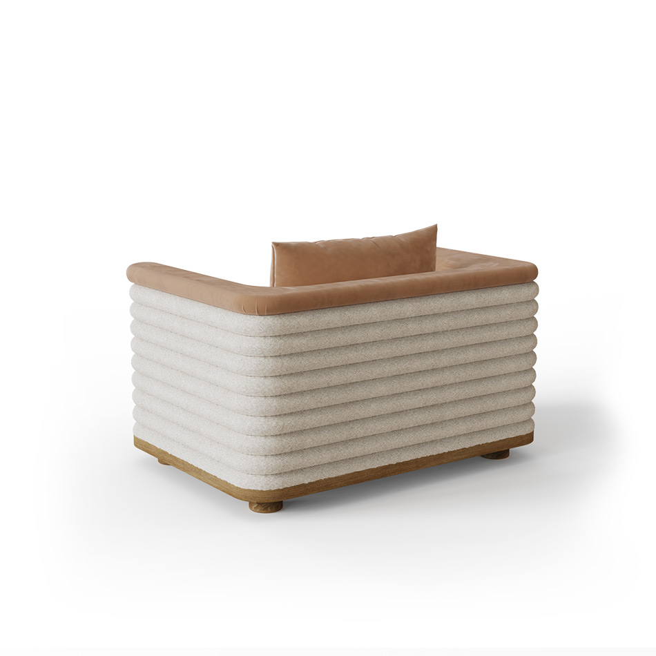 The armchair’s structure is characterized by its distinctive ribbed design, wrapped in soft boucle fabric, while the interior seating area is upholstered in luxurious velvet.
