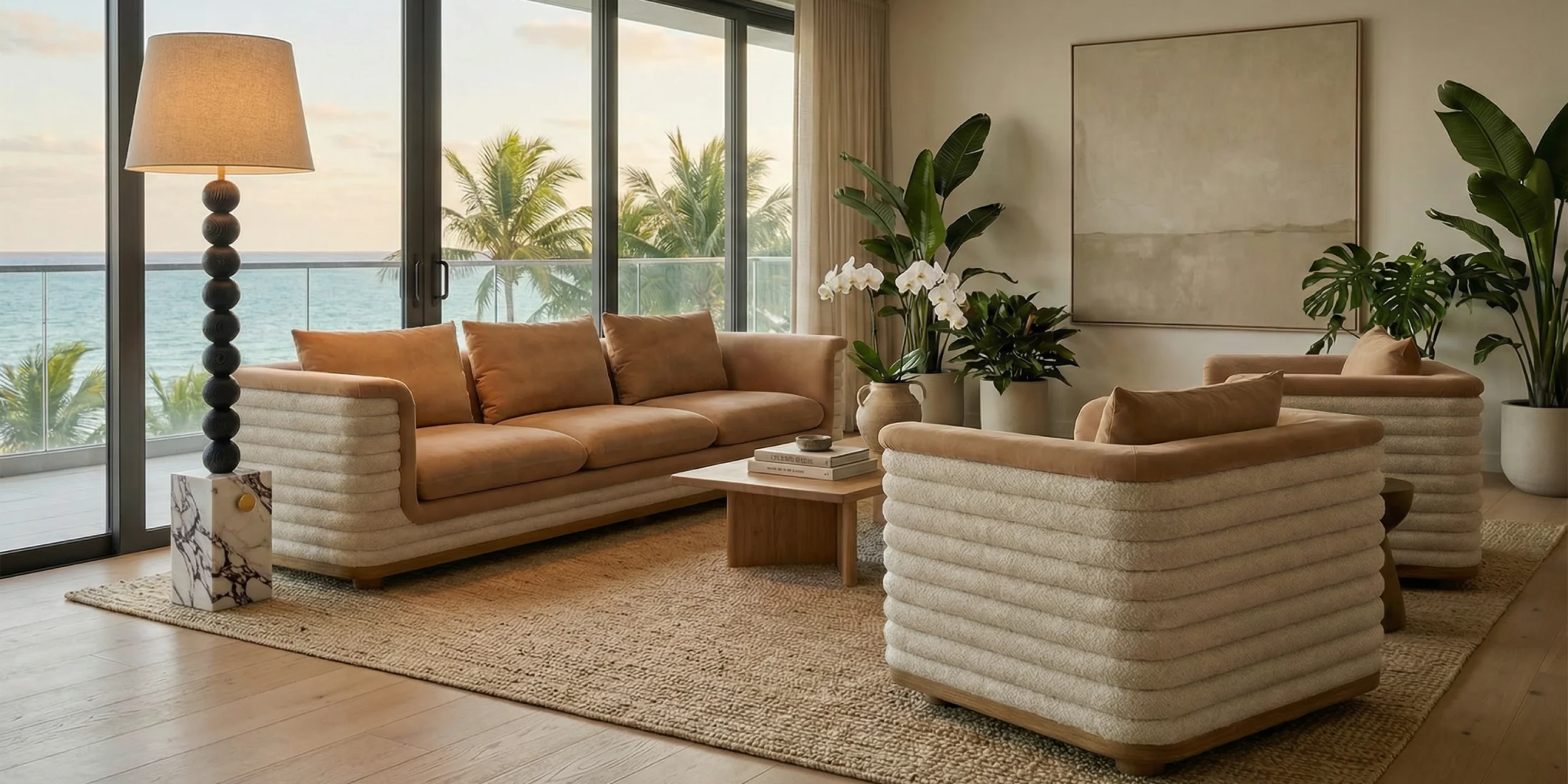 | Materials | Finishes | Bouclé, Velvet, Oak Matte |