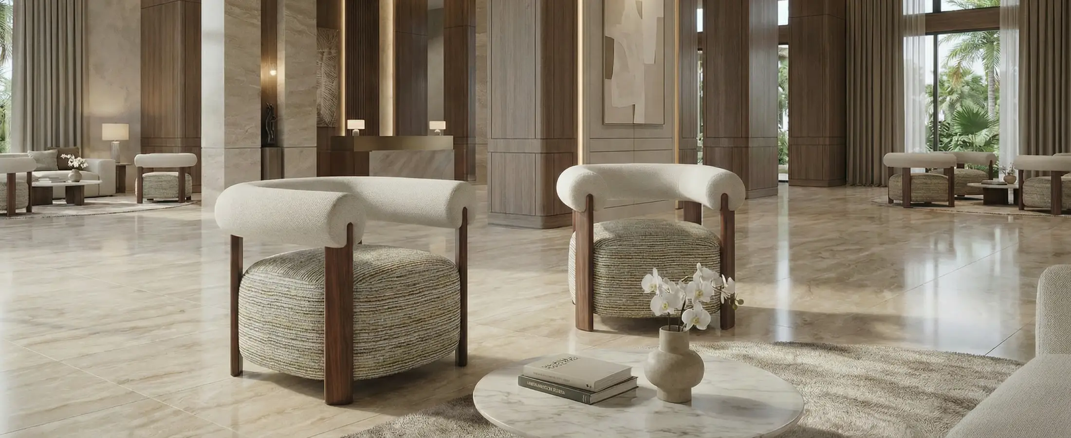 Comfort is generous, the cushioned seat and supportive back hold posture through conversation, making Claire a high-end accent for interior settings that favors calm lines and material clarity.