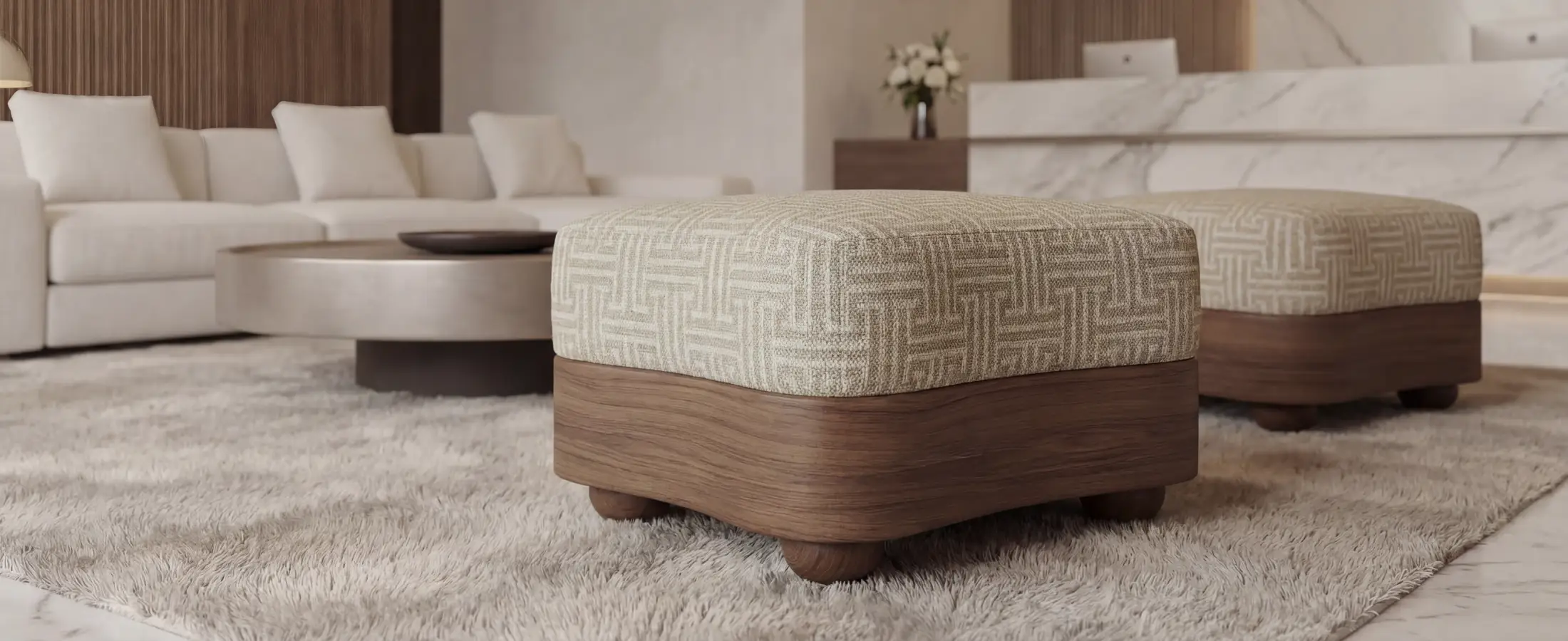 The seat edge is crisply finished to sharpen the geometry, and the sculpted timber base reads grounded yet light at floor level. Craft is quiet but precise, clean seams, and a compact footprint that behaves like a designer accent stool or an elegant ottoman.