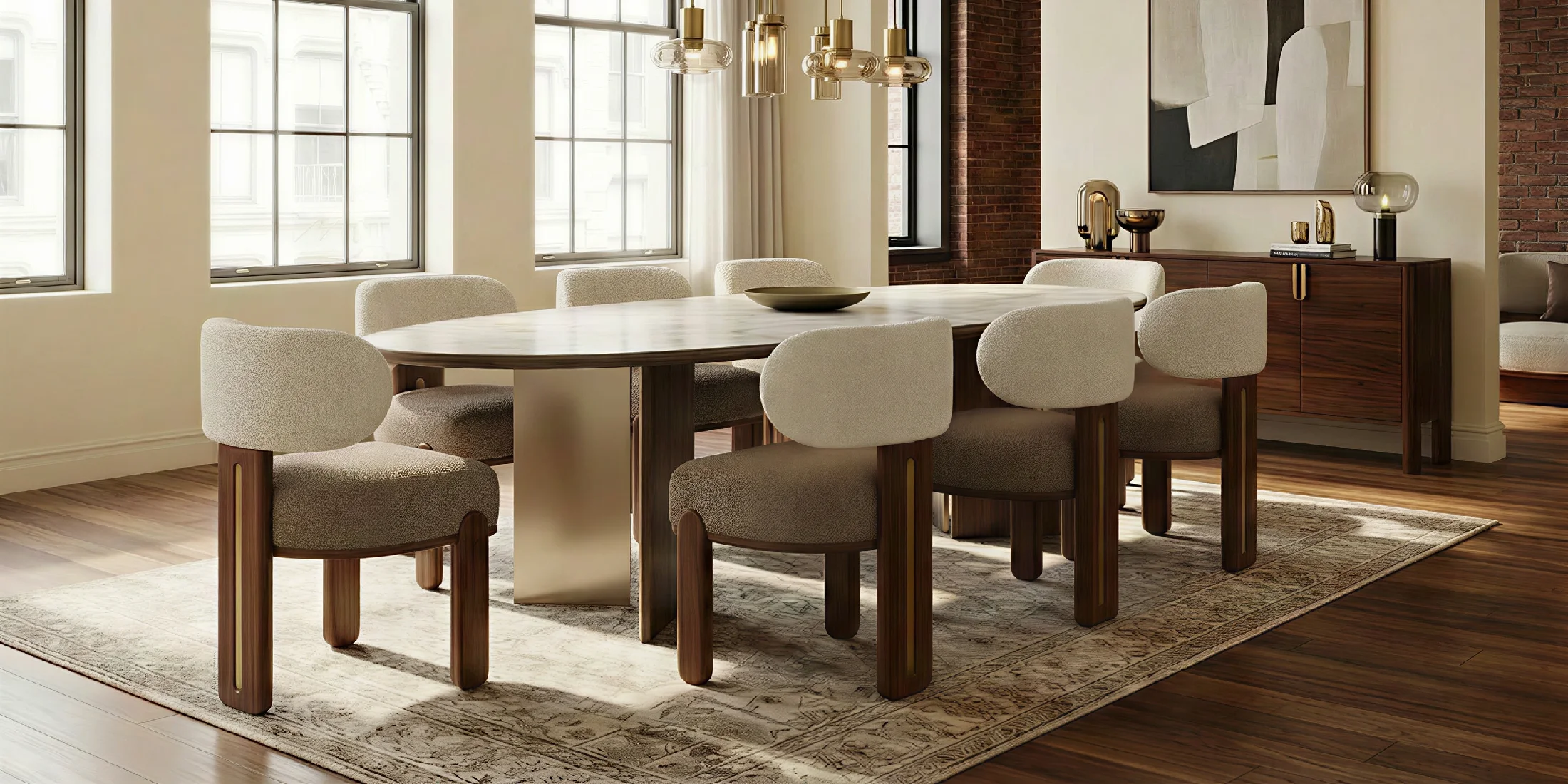 For the table, introduce Assia II Dining Table. Its travertine top with a sculptural walnut base echoes Diane’s palette and vertical nature, creating a unified stone-and-timber story across the setting.