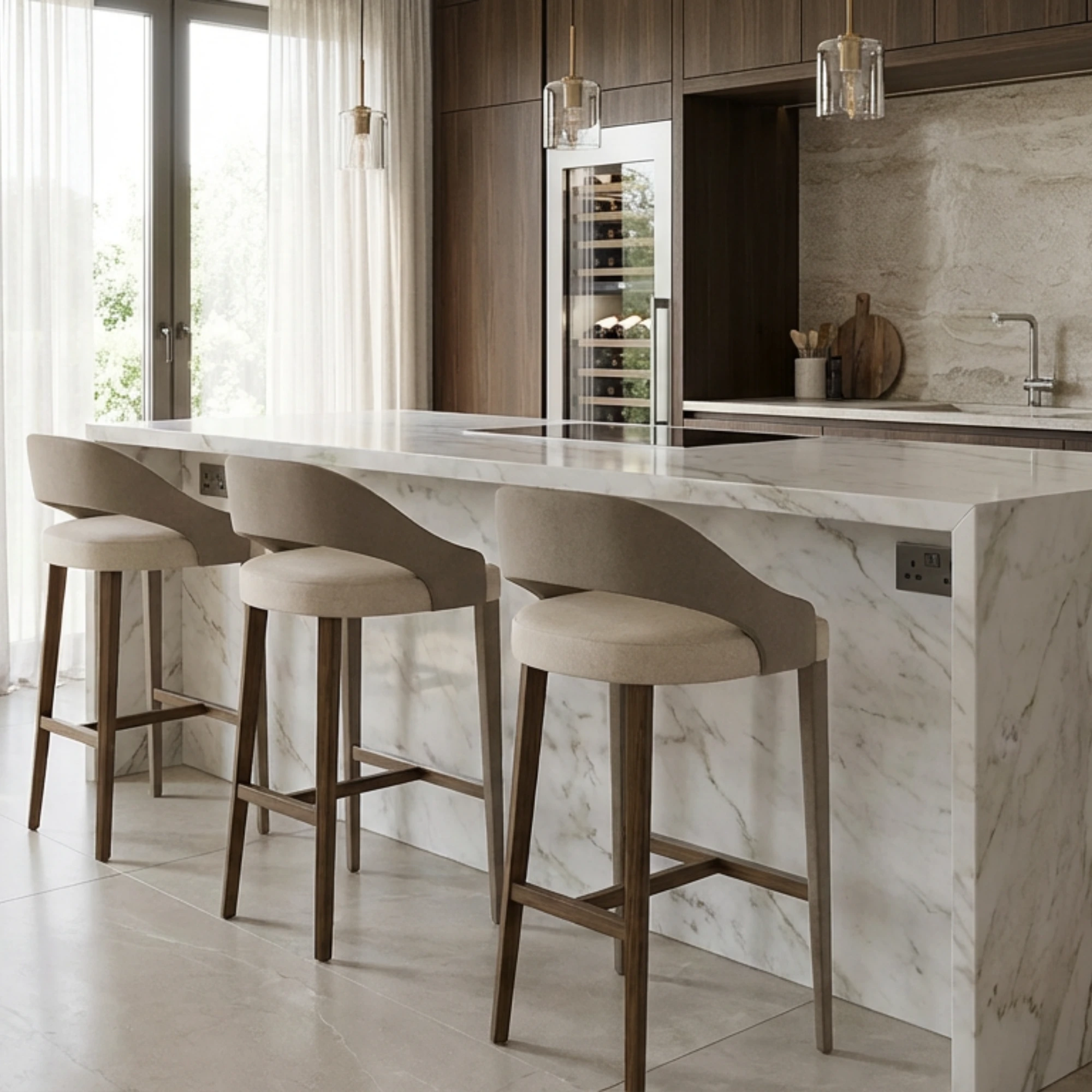 In the room, Dini behaves like high-end kitchen island seating, with precise upholstery that maintains a calm, composed outline from every angle.