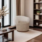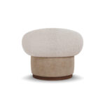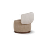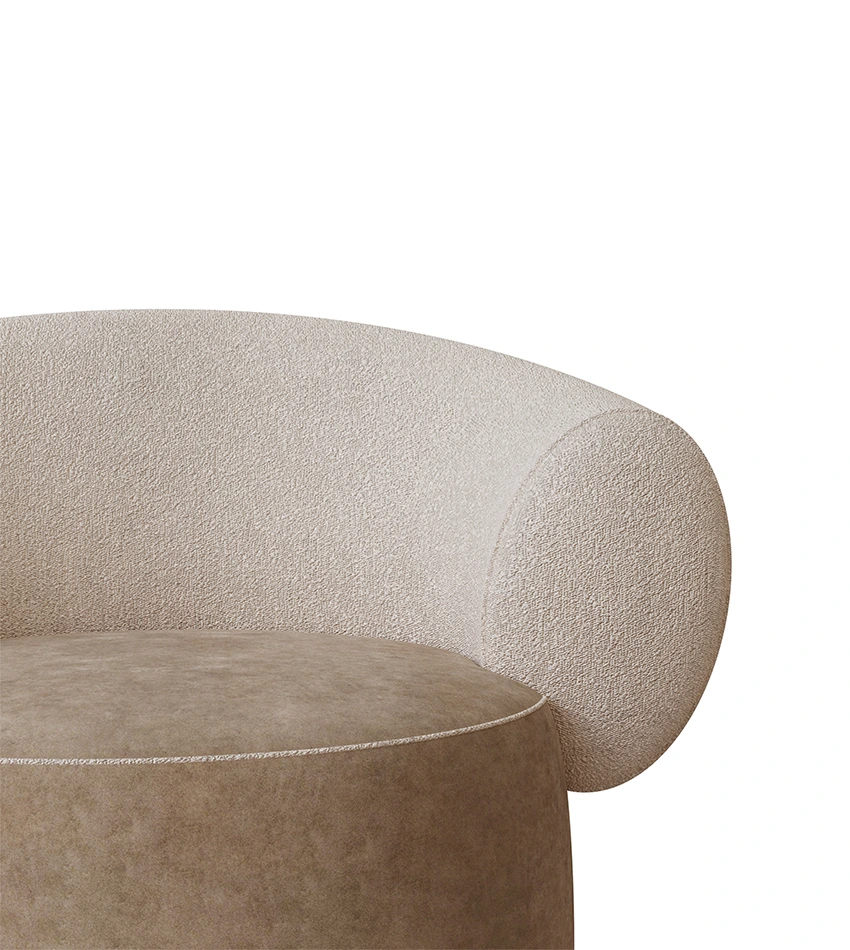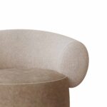 The Elise armchair boasts a distinctive curved backrest wrapped in soft boucle fabric, offering both a tactile and visual delight.