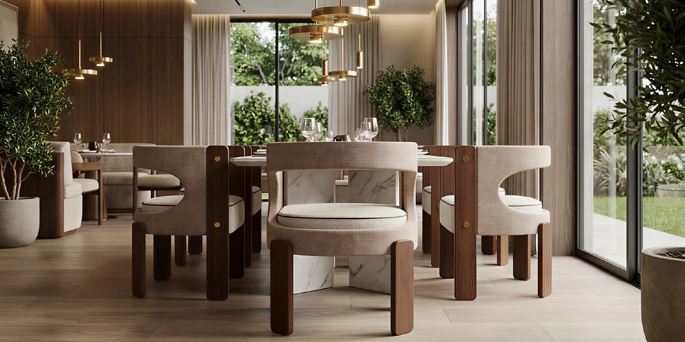 As a modern dining chair interpreted through tactility and proportion, Fay sits neatly in multiples and holds posture from every angle. Pair it with Elodie Dining Table to echo the chair’s curves and timber language, creating a cohesive stone-and-wood narrative across the room.