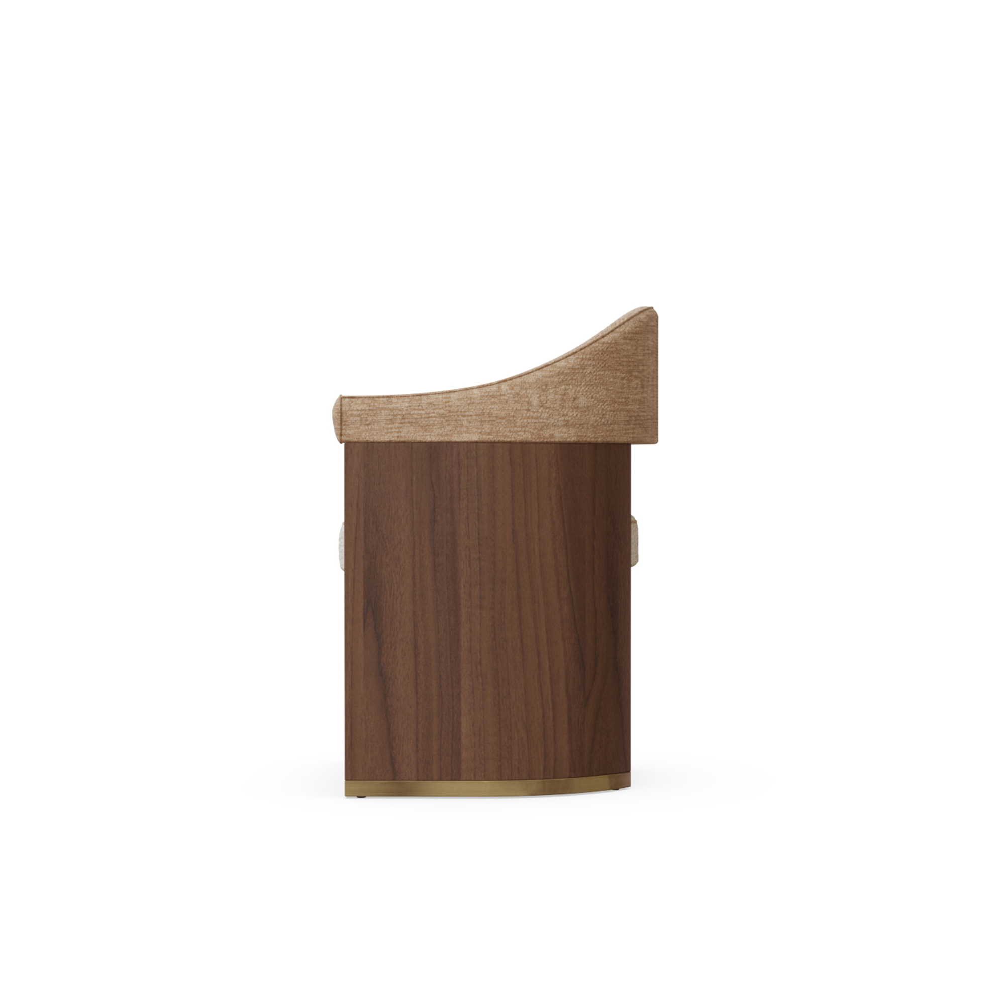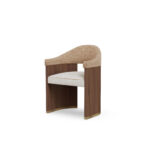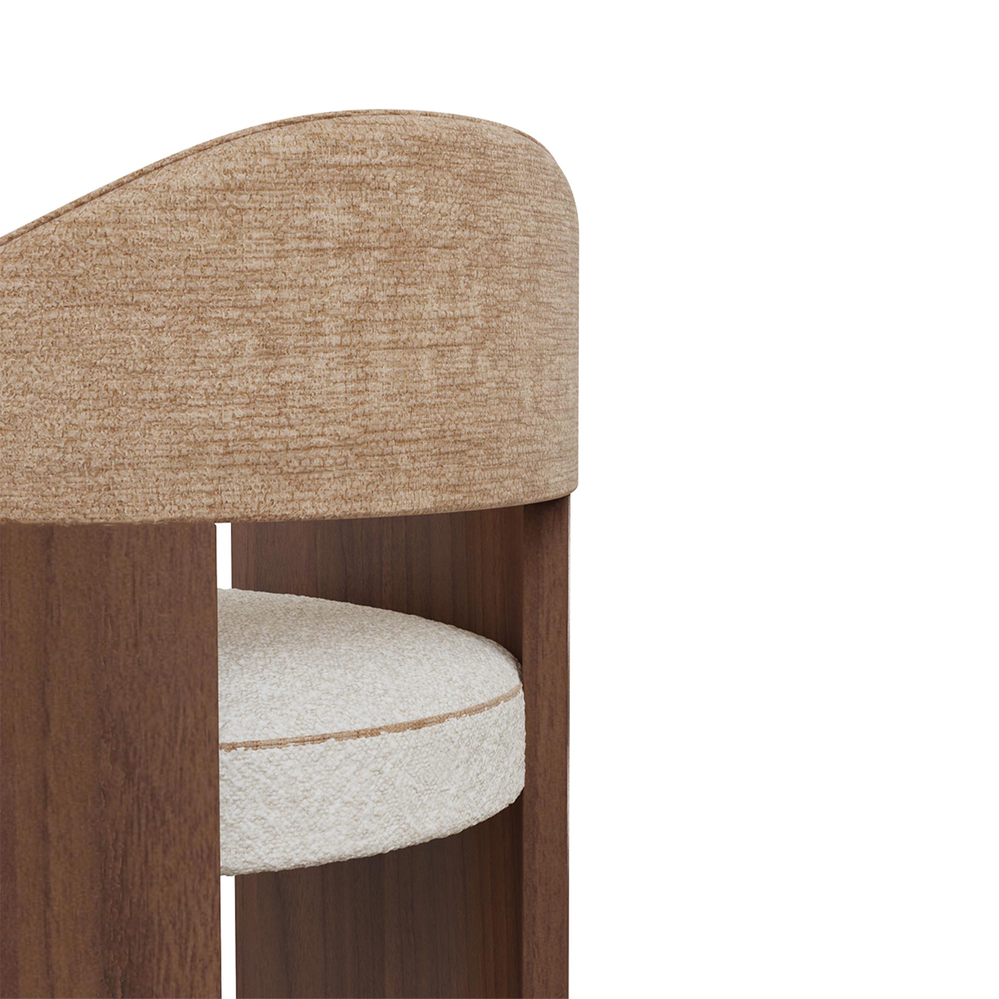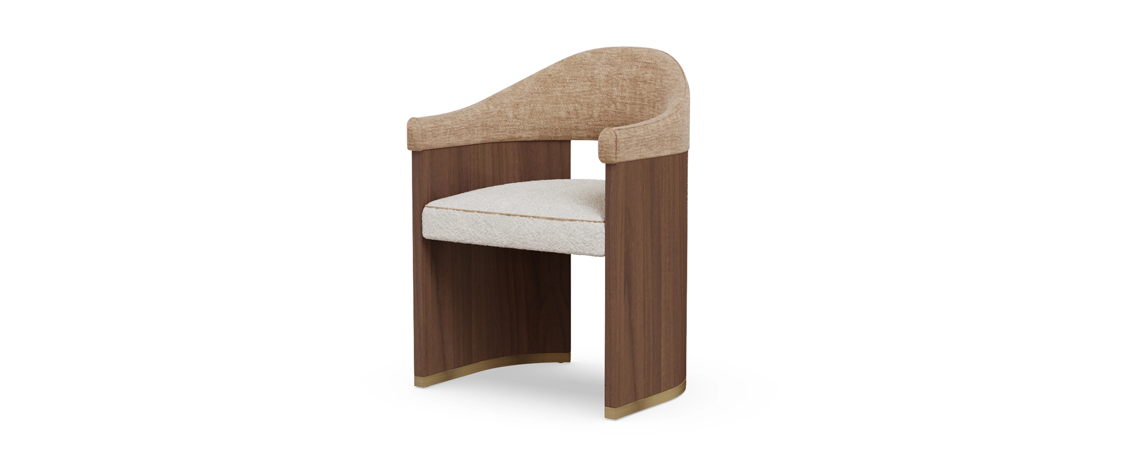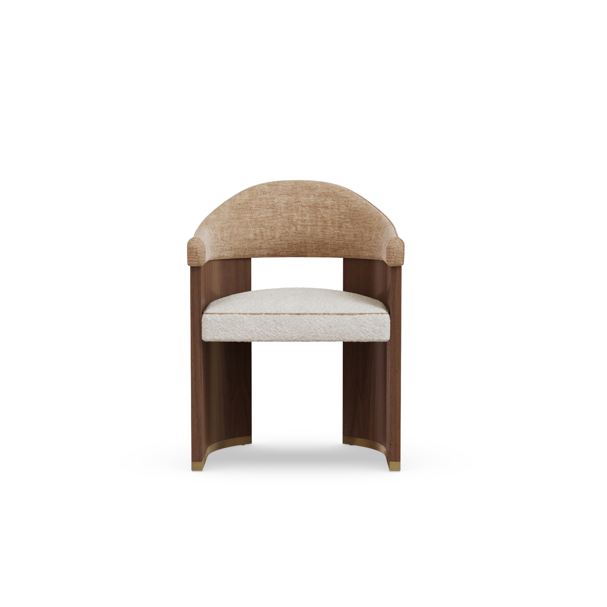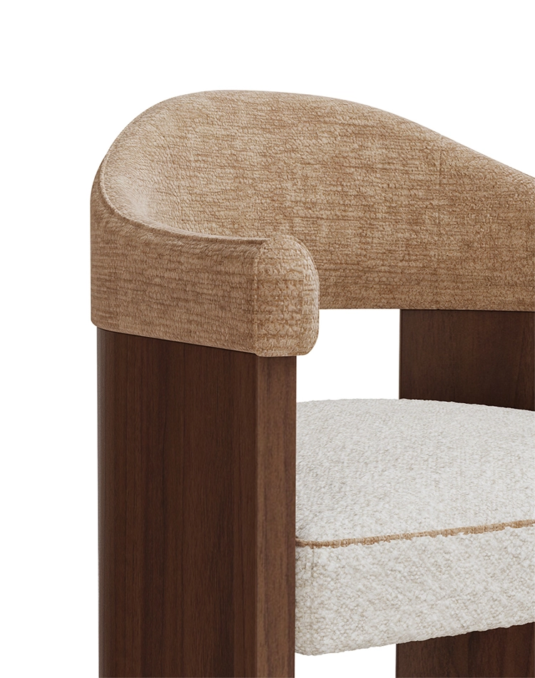 Elevate your dining space with the Junna Dining Chair — where bold walnut curves embrace a plush, bouclé backrest, merging modern sophistication with inviting comfort.