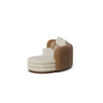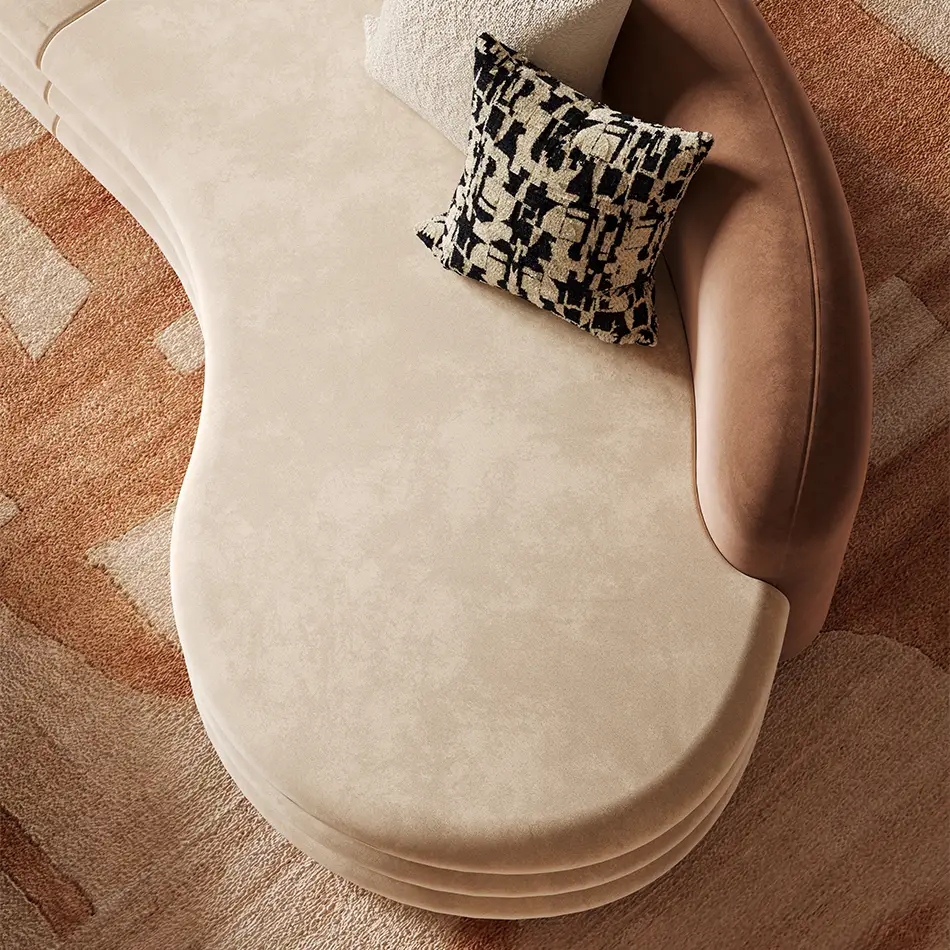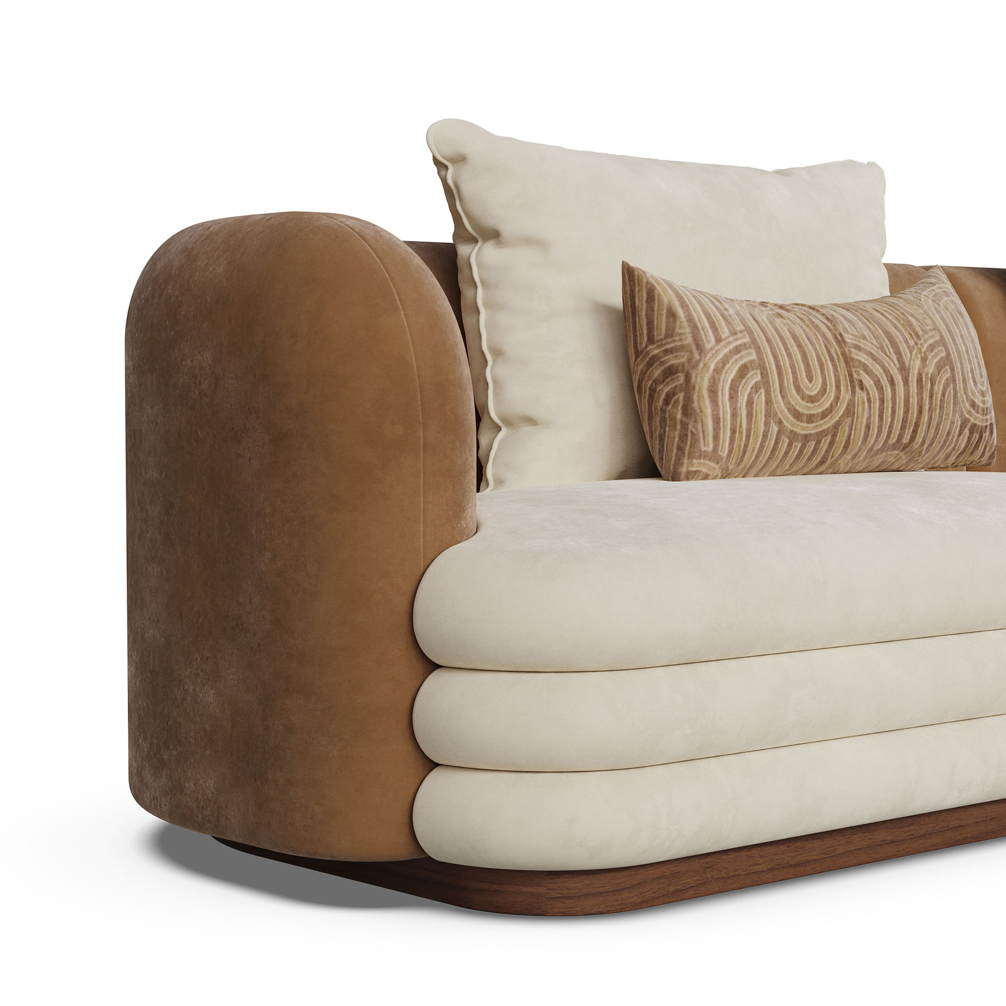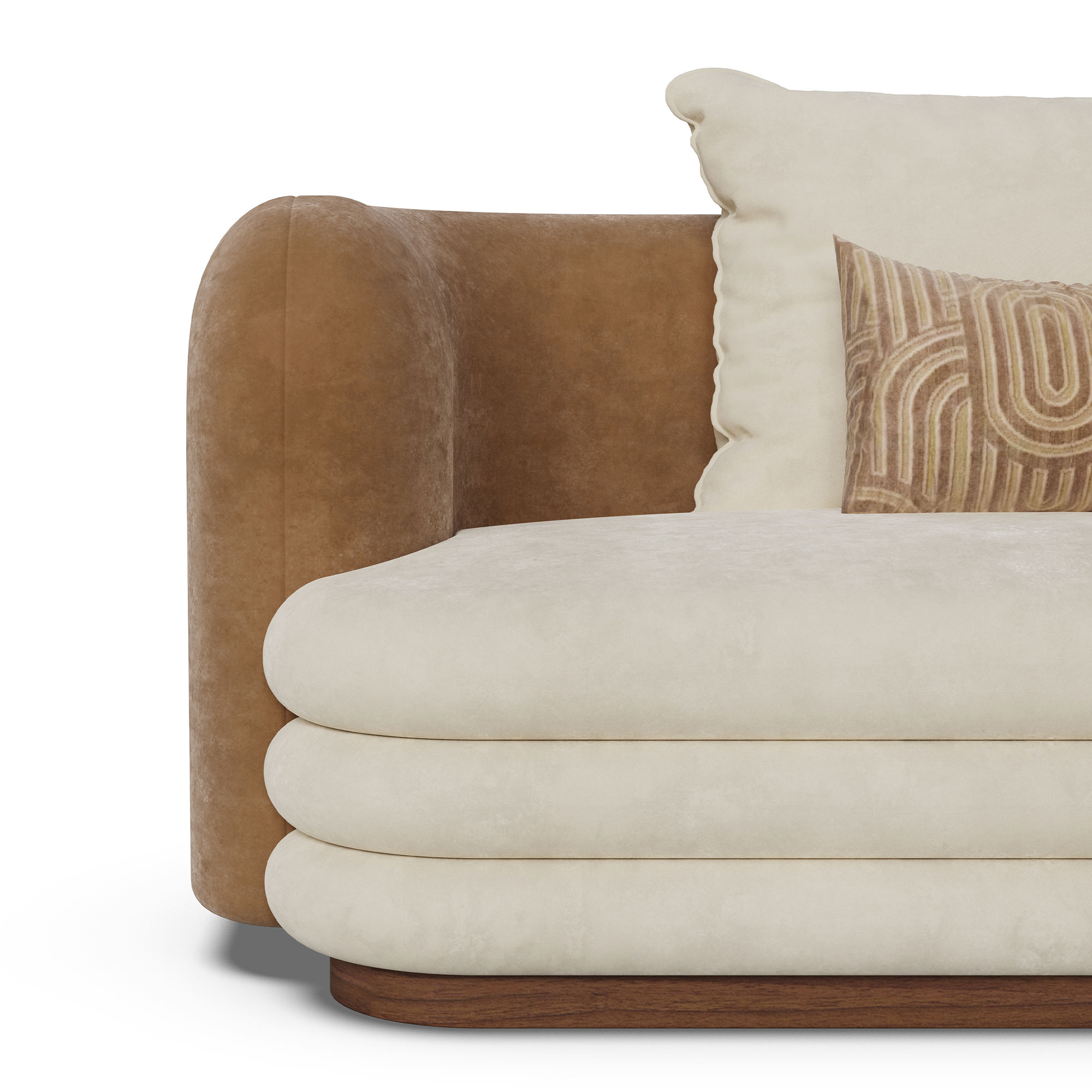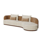 The sofa’s arms and base are covered in a rich, beige fabric, adding depth and texture to its overall appearance.