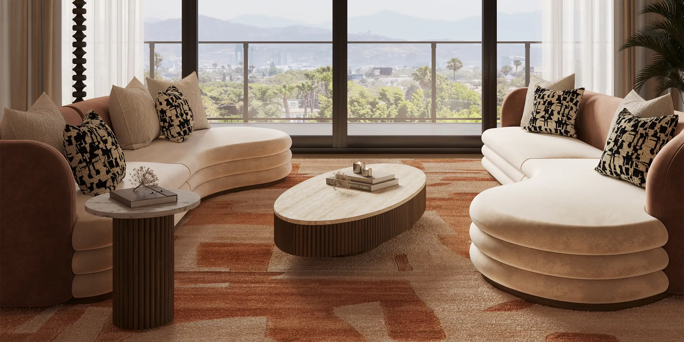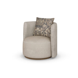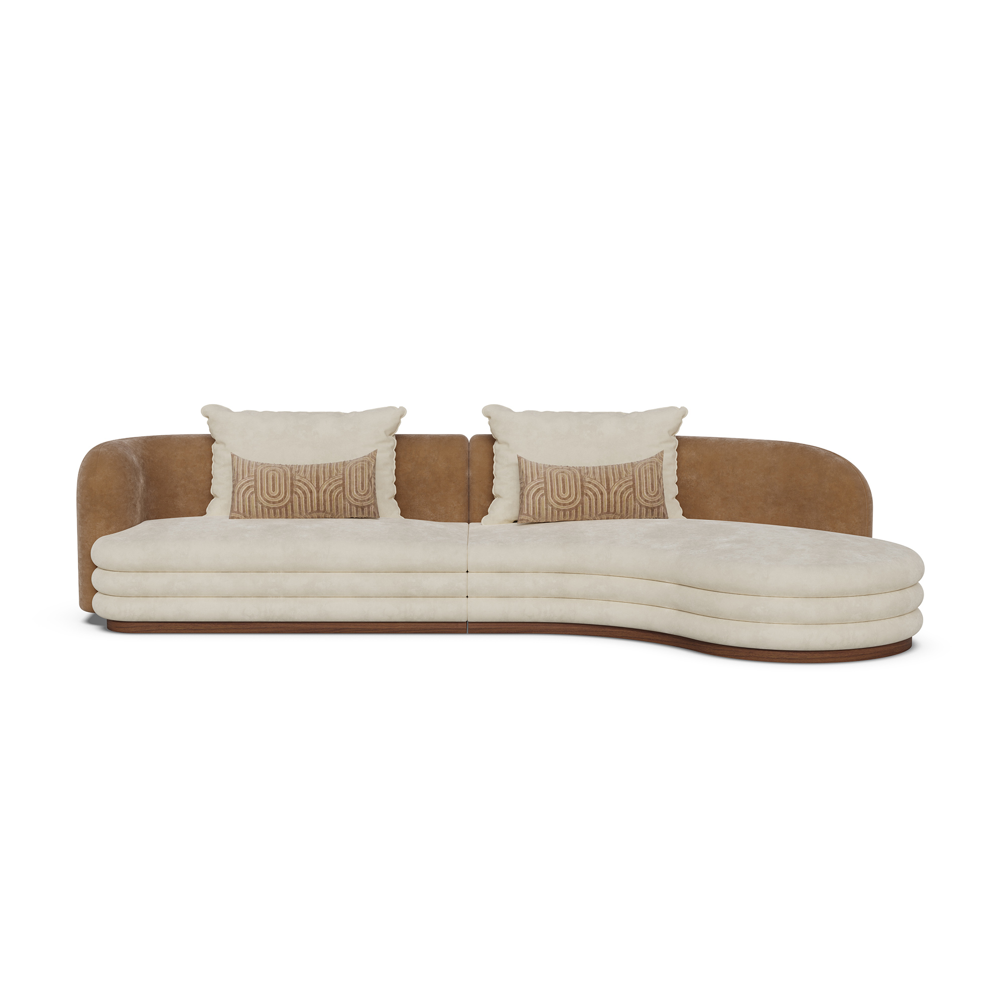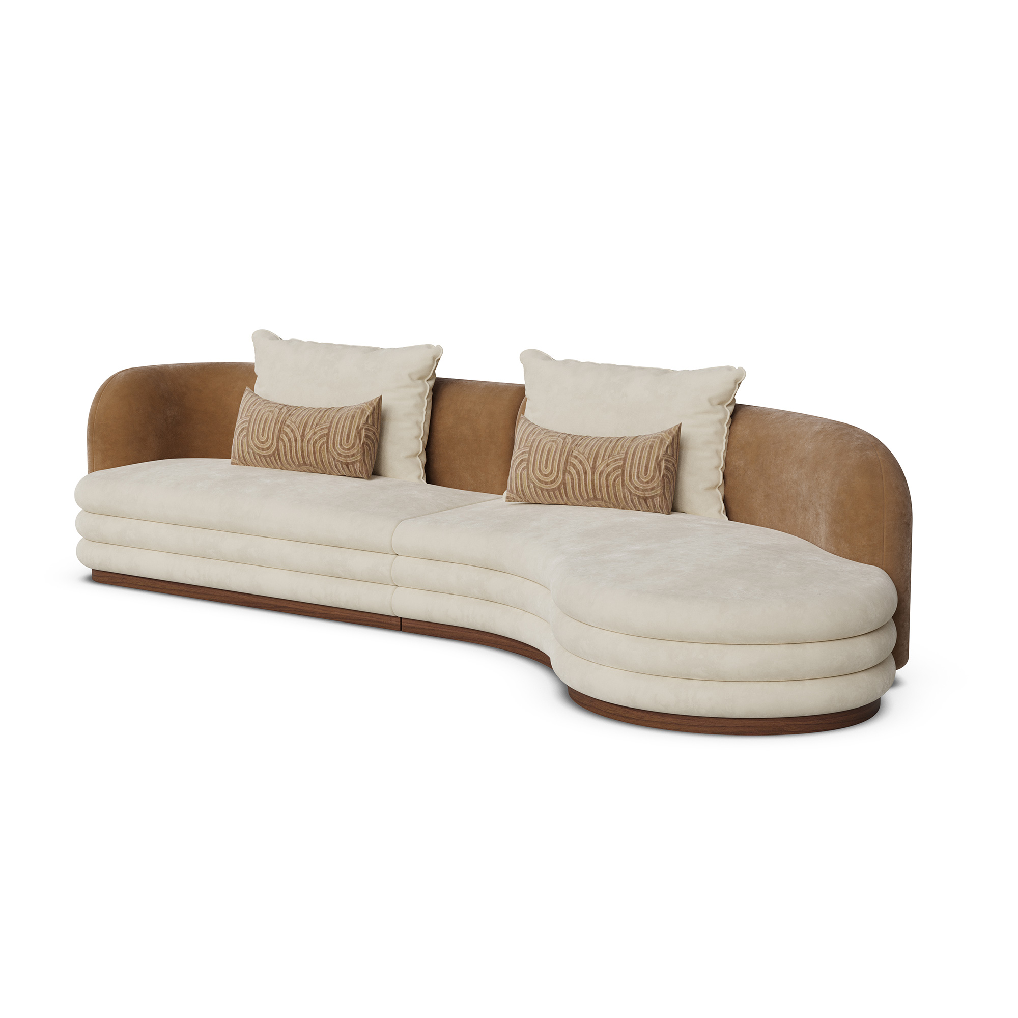 The sofa’s arms and base are covered in a rich, beige fabric, adding depth and texture to its overall appearance.