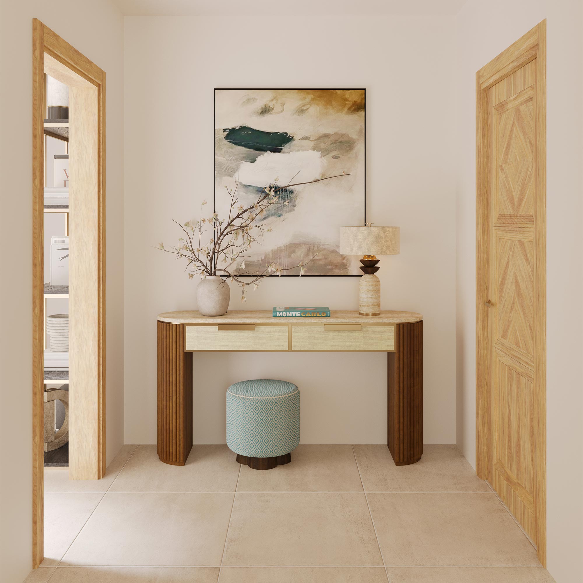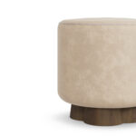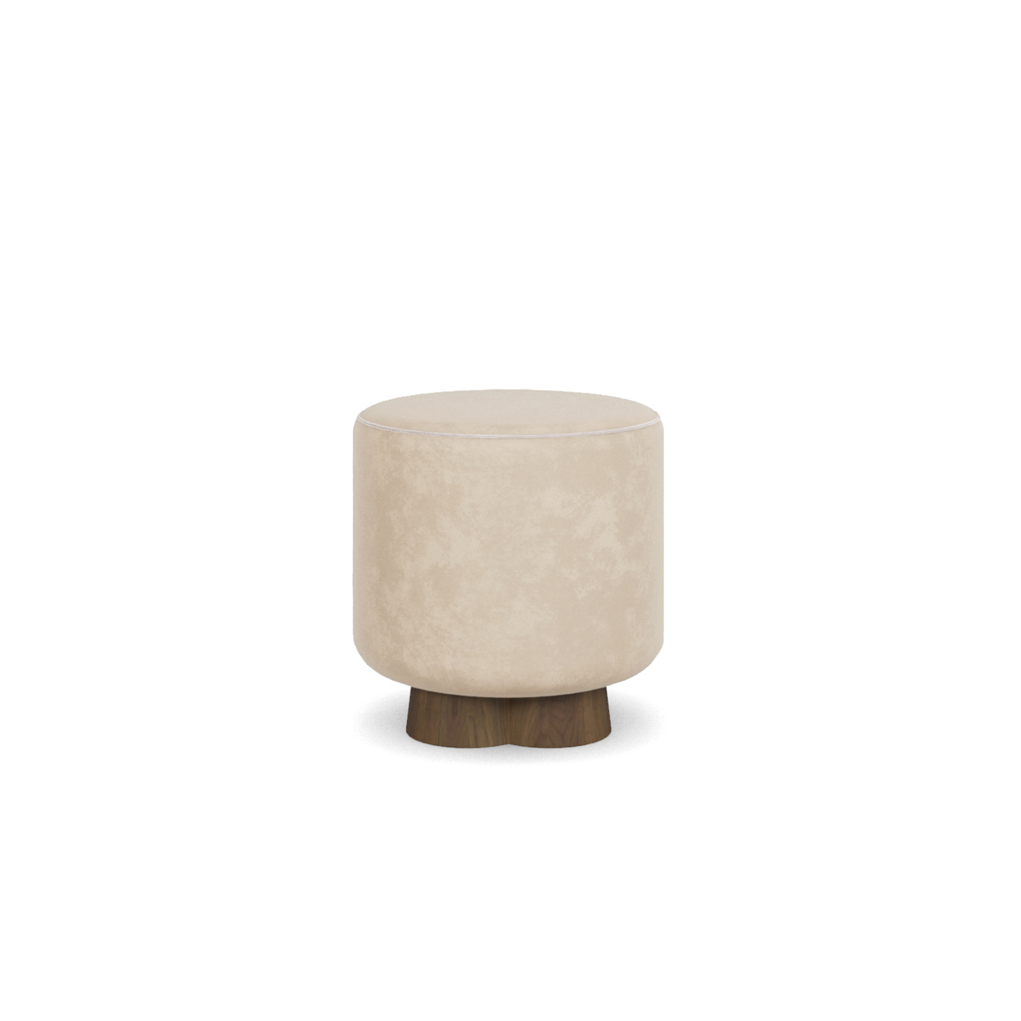 The Mae Stool offers a plush upholstered seat and a sophisticated walnut base with a wave pattern.