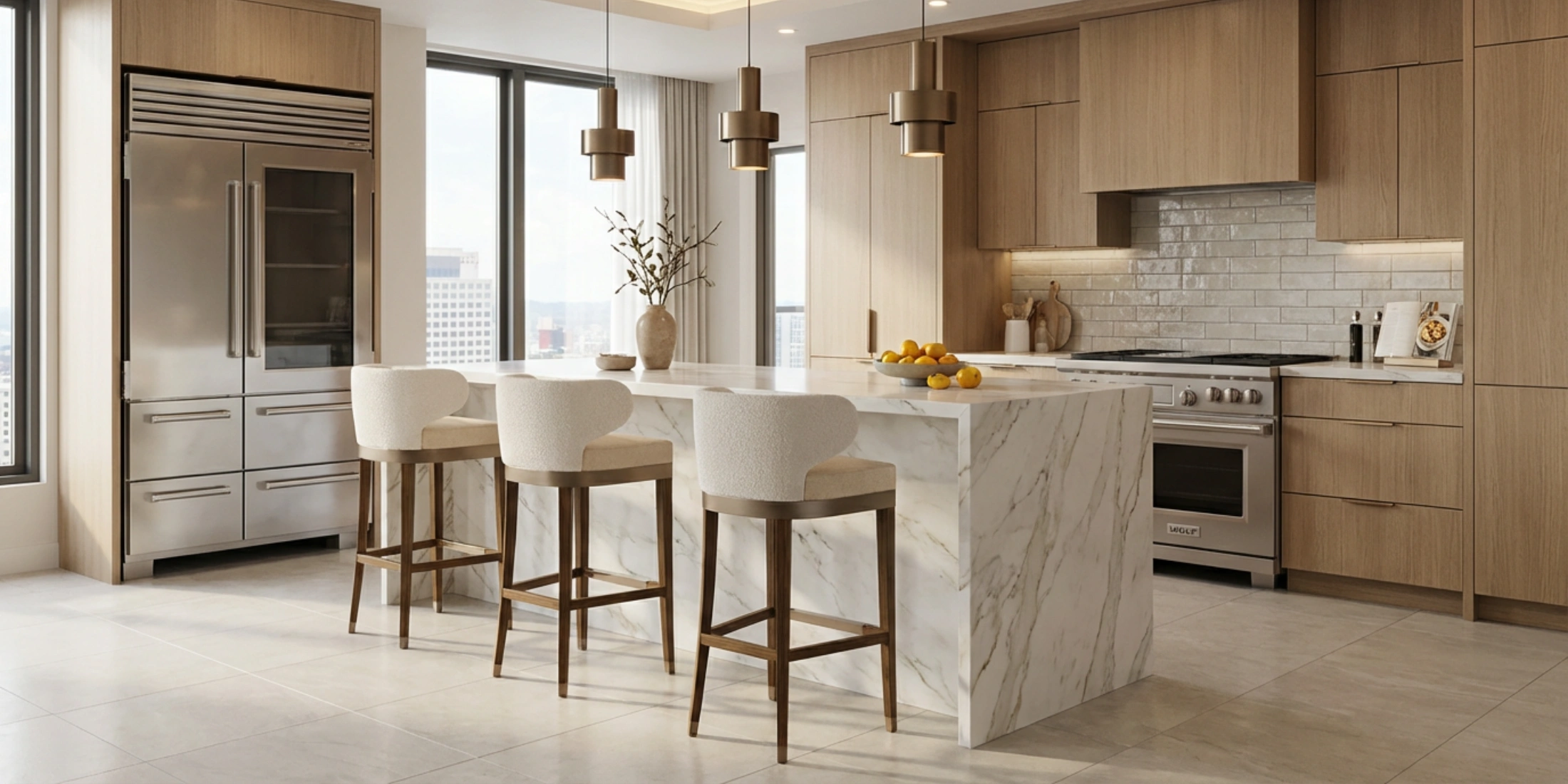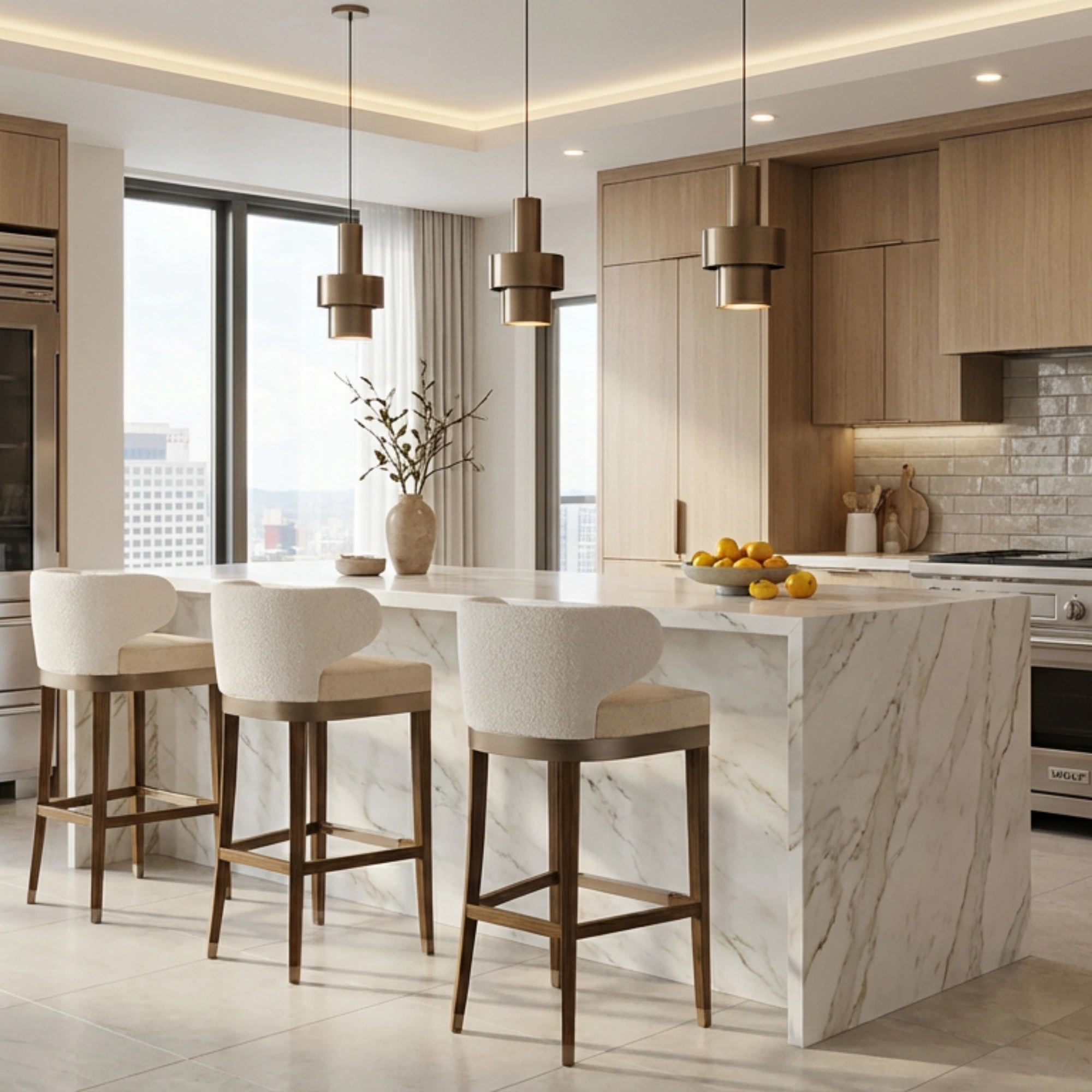 At a kitchen island or cocktail counter, Méredith behaves as bar seating for kitchen islands that balances comfort and clarity: generous enough for long conversations, disciplined enough to keep the space visually calm.
