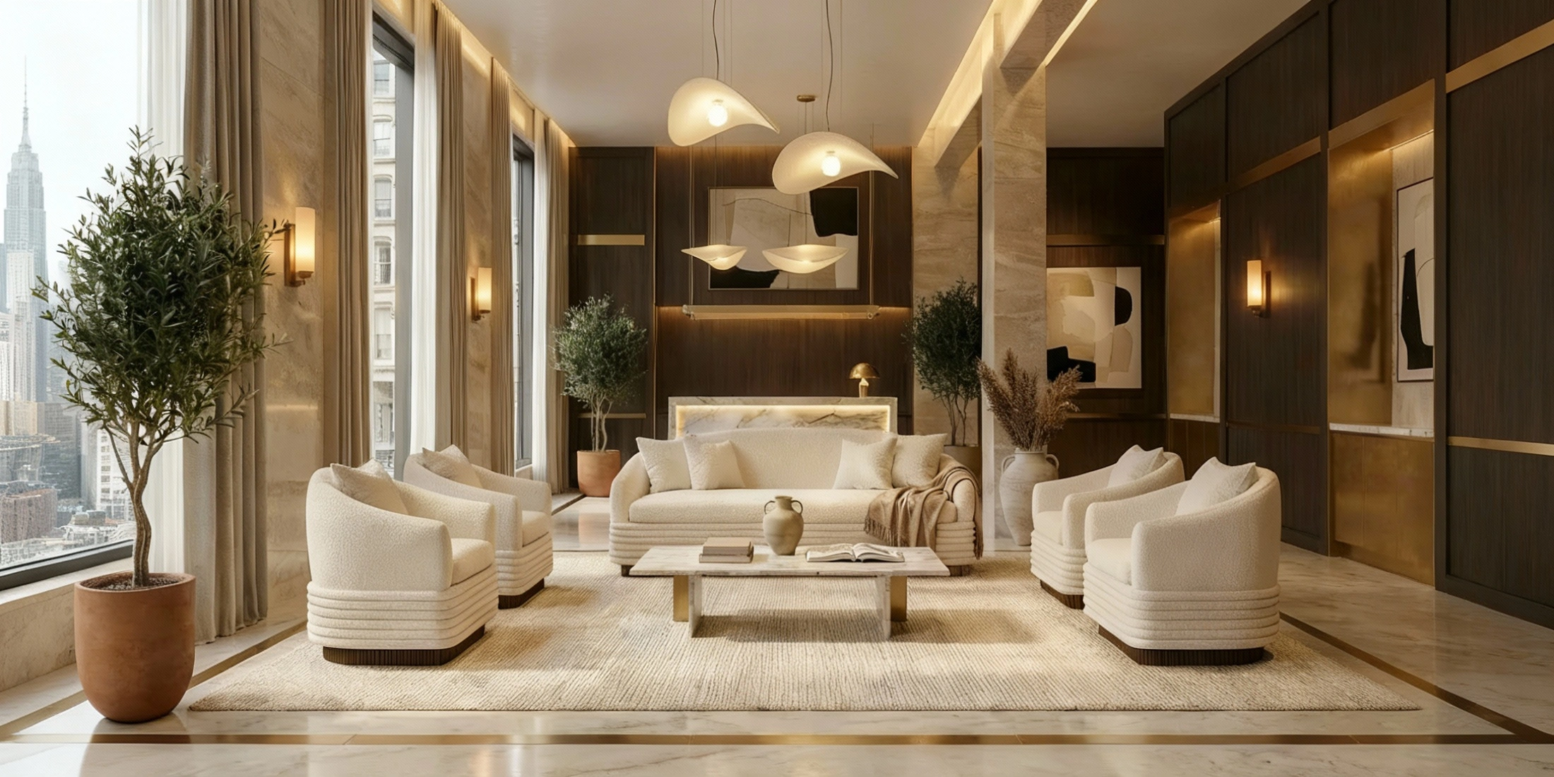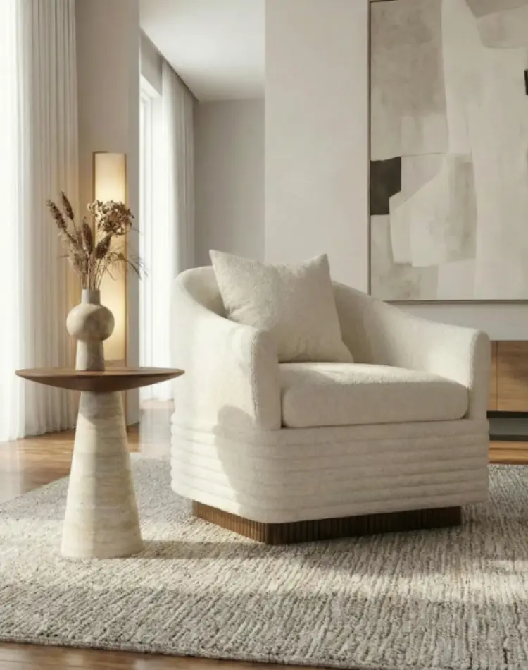 Nina Armchair is a bouclé lounge chair with walnut frame conceived as a quiet architectural piece for living spaces and suites. Its outline stays low and composed, sitting in balance with the interior rather than competing with it.