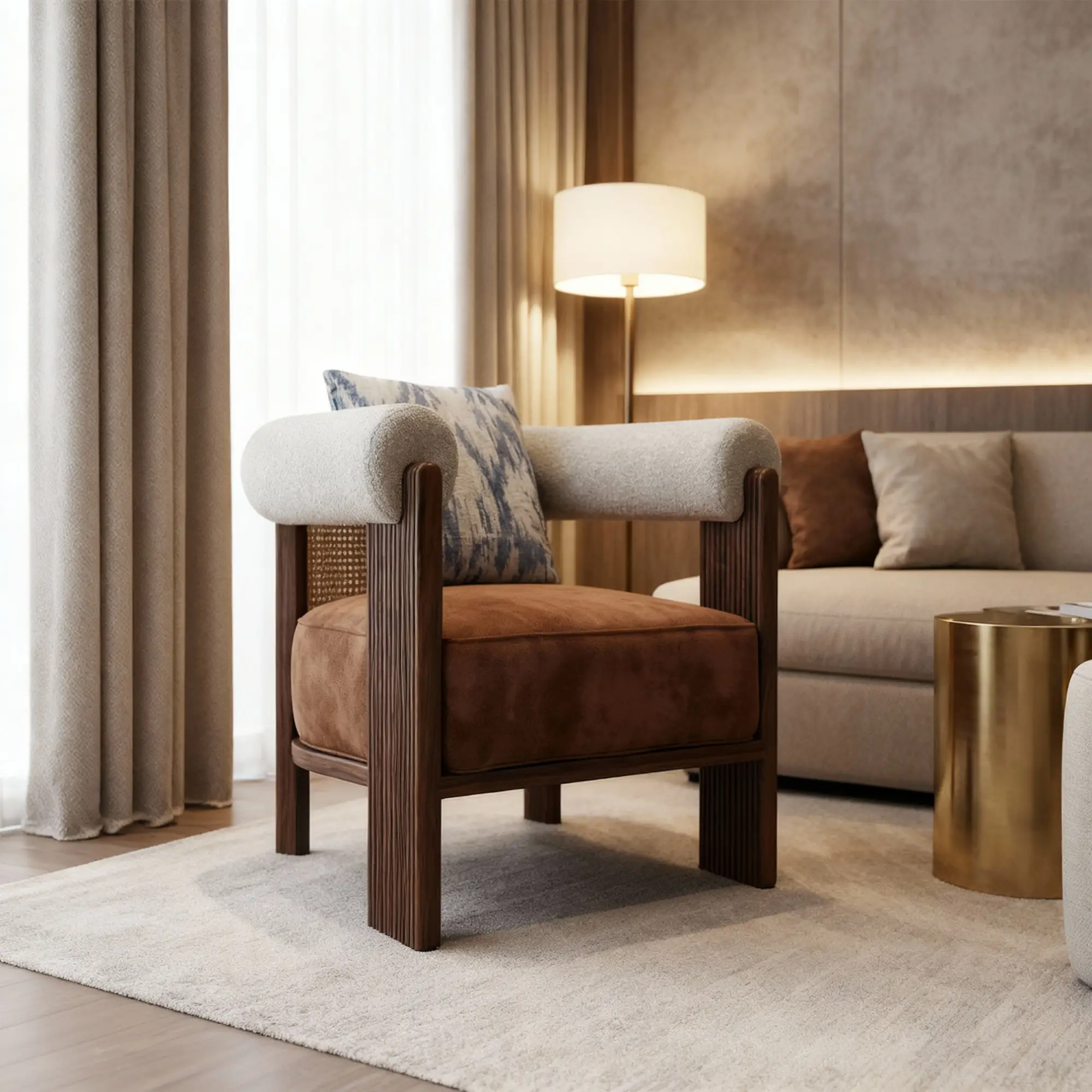 Olivia Armchair is a velvet armchair with rattan back conceived as a quiet, material-led piece for living rooms, suites, and reading corners. Its presence is calm and composed, with an organic silhouette that feels drawn from the floor plan rather than imposed on it.