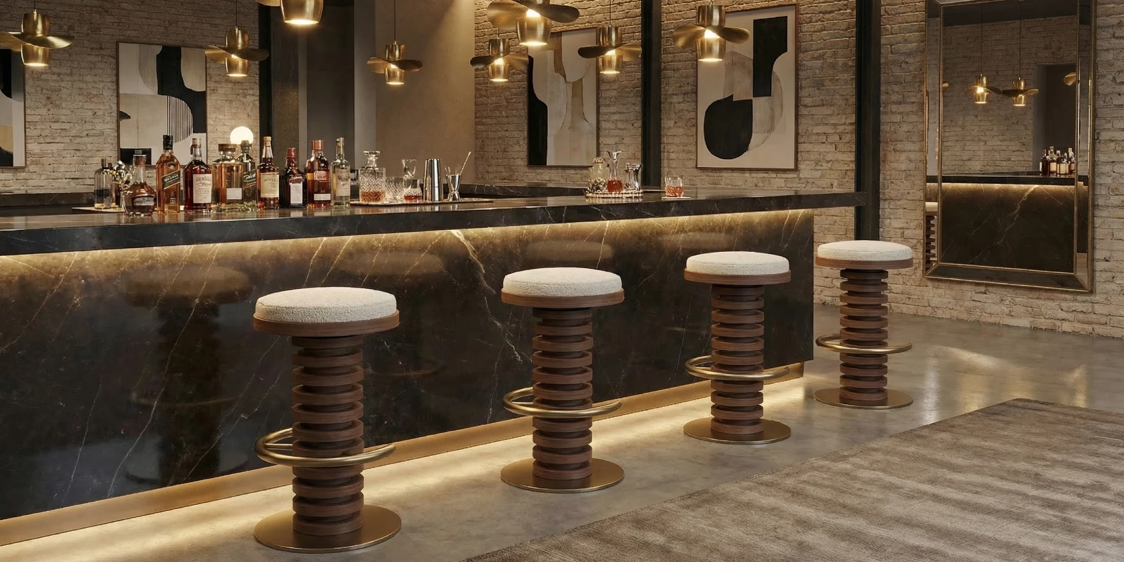 Lola Bar Chair, a sculptural blend of walnut wood, brass accents, and plush comfort for elevated interiors.
