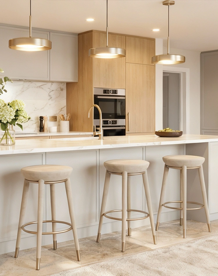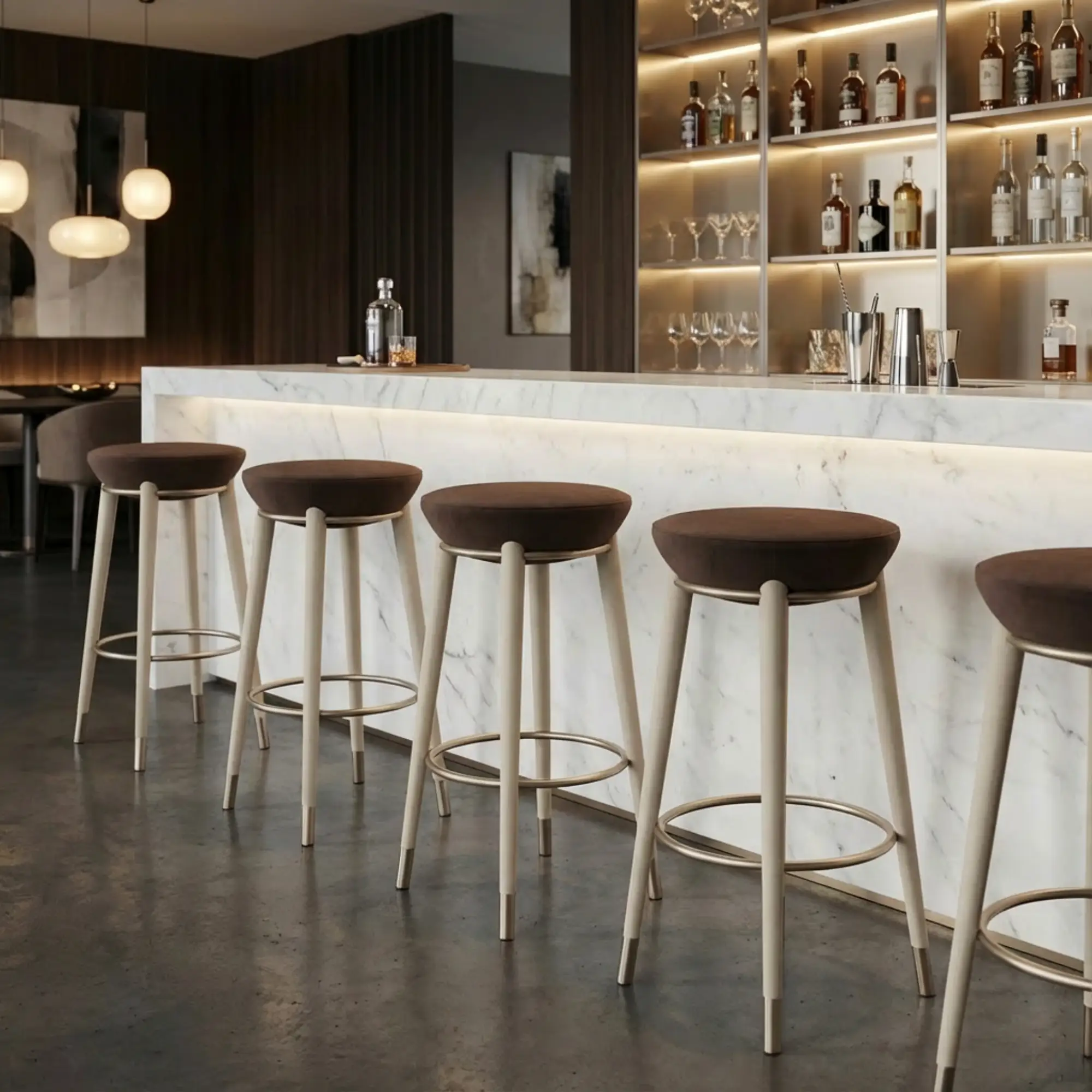 Rondi II Bar Chair is an upholstered walnut bar chair conceived as a refined architectural line at counter height. Its profile is calm and composed, bringing a tailored presence to kitchens, bars, and hospitality projects.