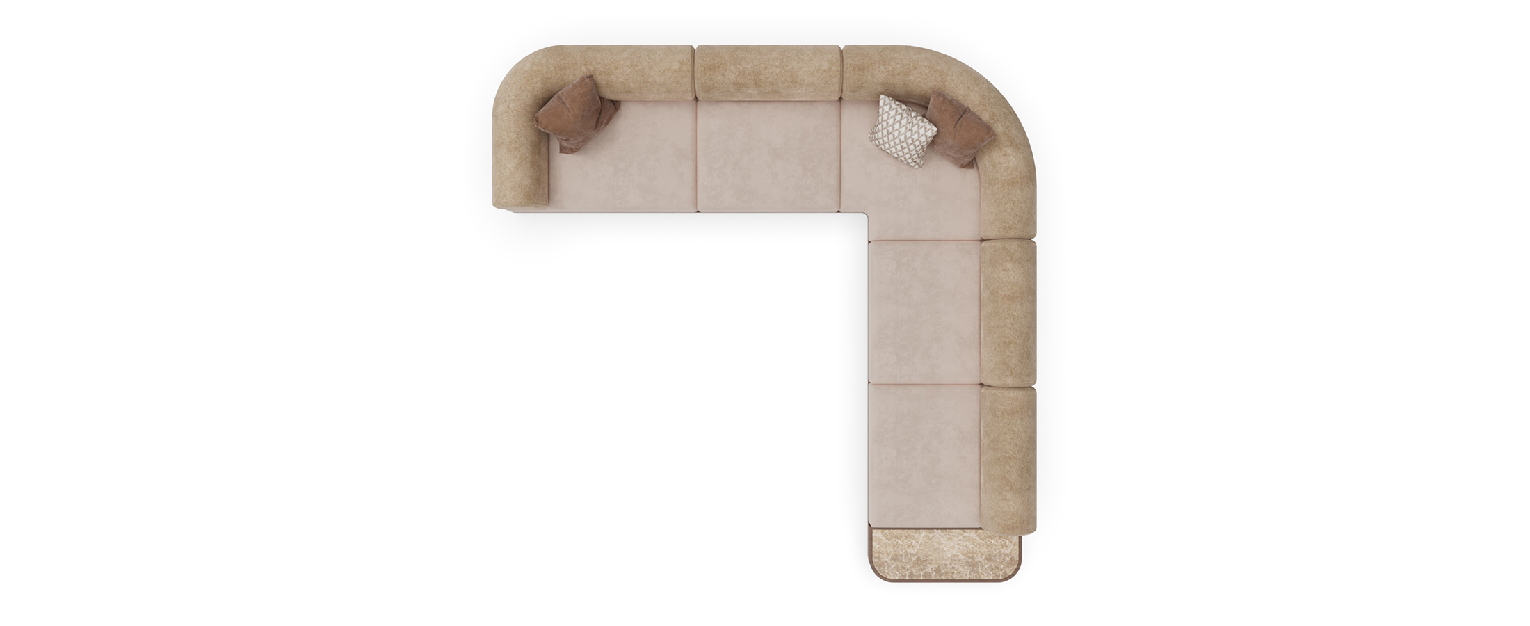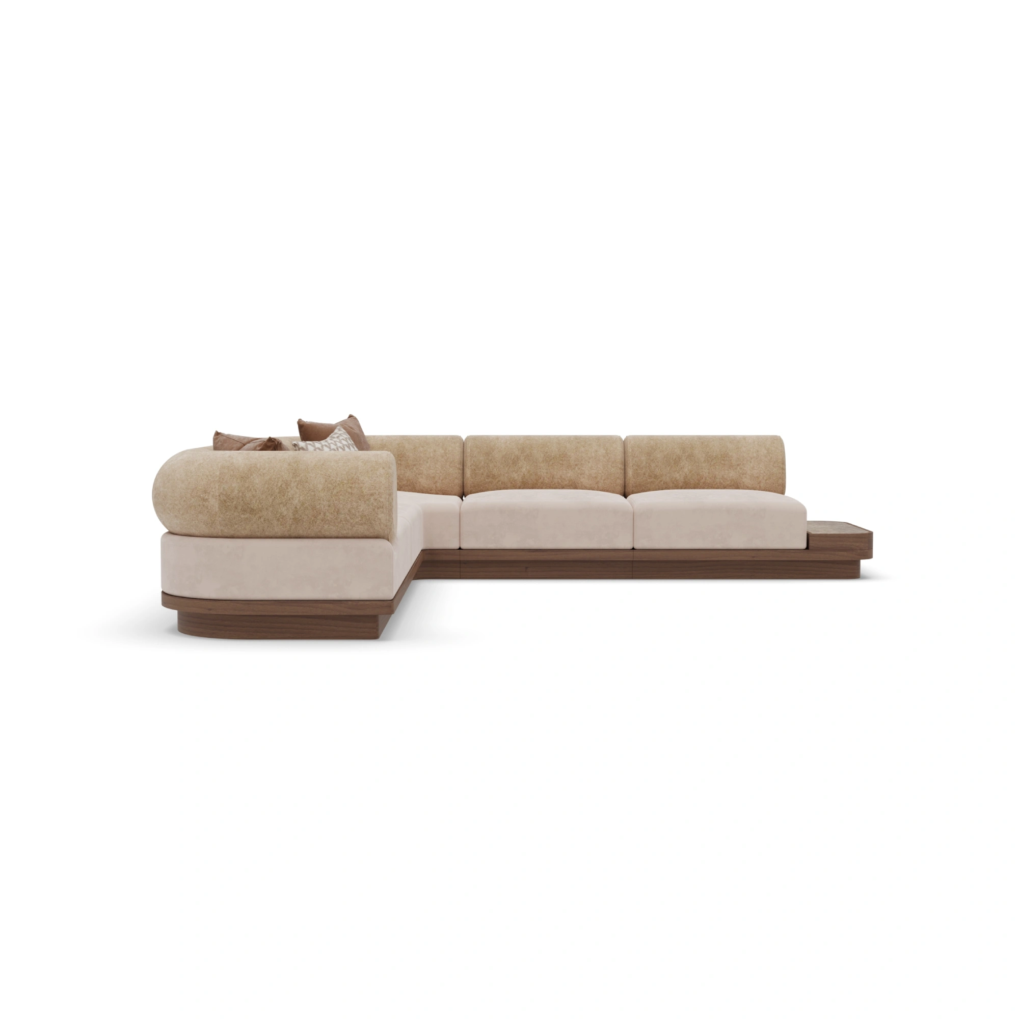 The Velora Sectional Sofa is defined by its generous proportions, architectural base, and inviting comfort. Designed with a low, linear profile, Velora combines expansive seating with softly rounded backrests, creating a balanced silhouette that feels both grounded and relaxed.