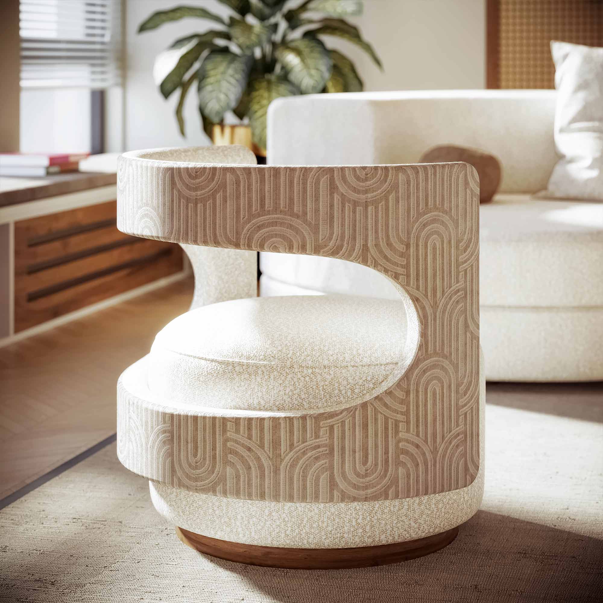 The standout feature of the Tess armchair is its distinctive spiraled backrest with an intricate pattern, adding a touch of artistic elegance to any space.