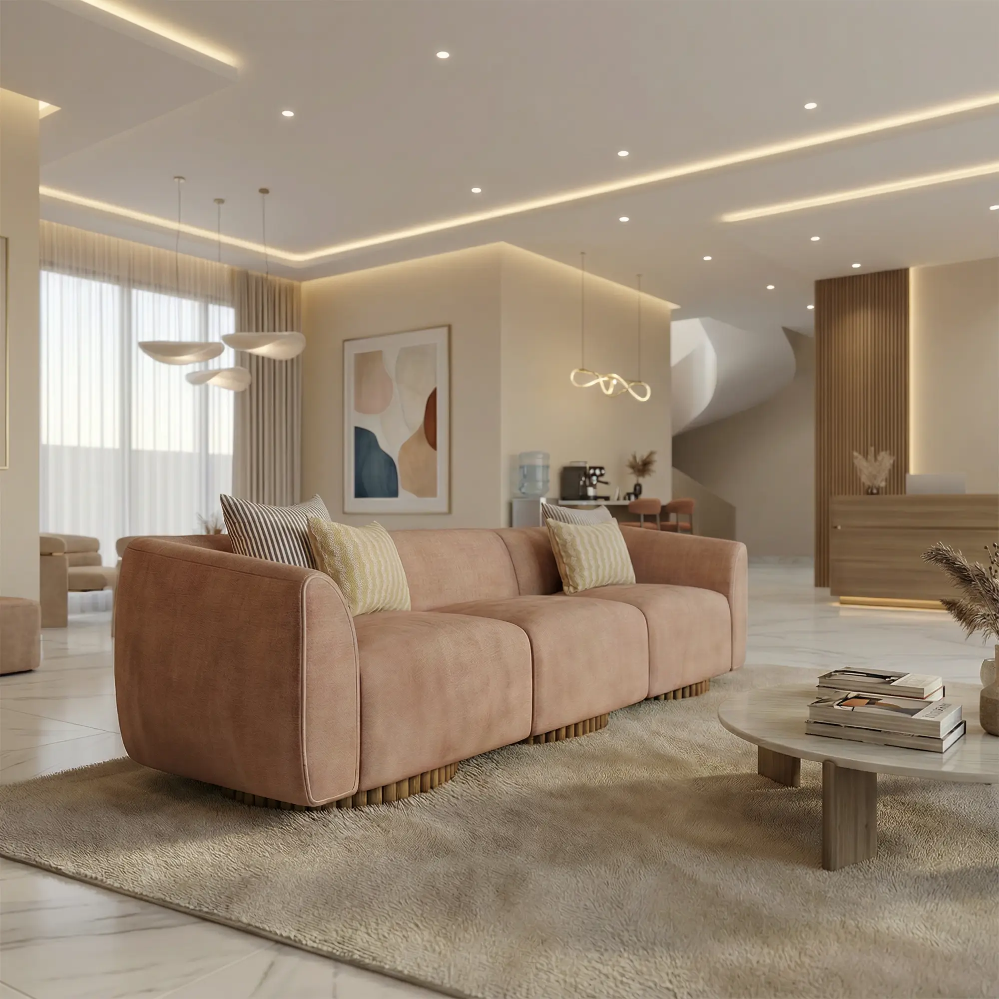 Wave Sofa is a luxury curved velvet sofa conceived as a low, flowing volume for composed living spaces. Its continuous line reads as a single gesture, bringing softness to architectural rooms without visual noise.