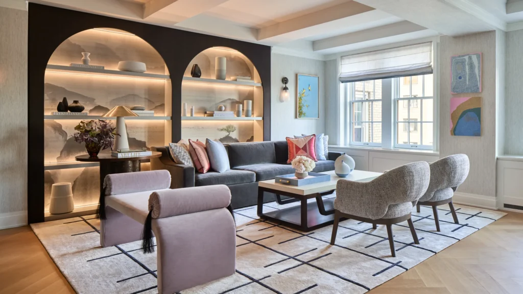 For this Upper East Side residence, Toumbakaris opted for a classic-meets-modern aesthetic. Neutral tones were paired with pops of jewel-toned accents, while antique mirrors and sculptural lighting fixtures added a touch of glamour.