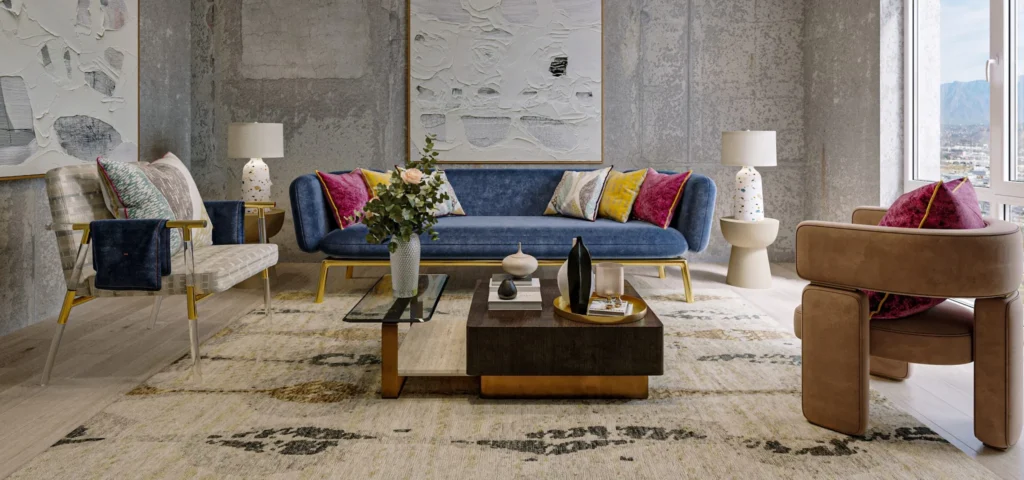 - Anchor seating clusters with substantial rugs to prevent visual drift.