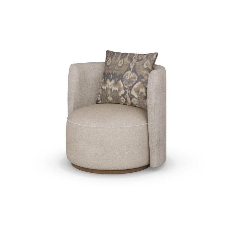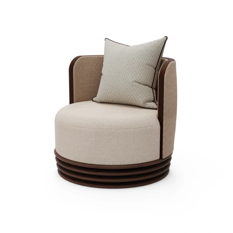 Round luxury armchair with cream fabric, beige accents, and a walnut wood wavy base, featuring a plush cushion, designed by Nolita Harbour.