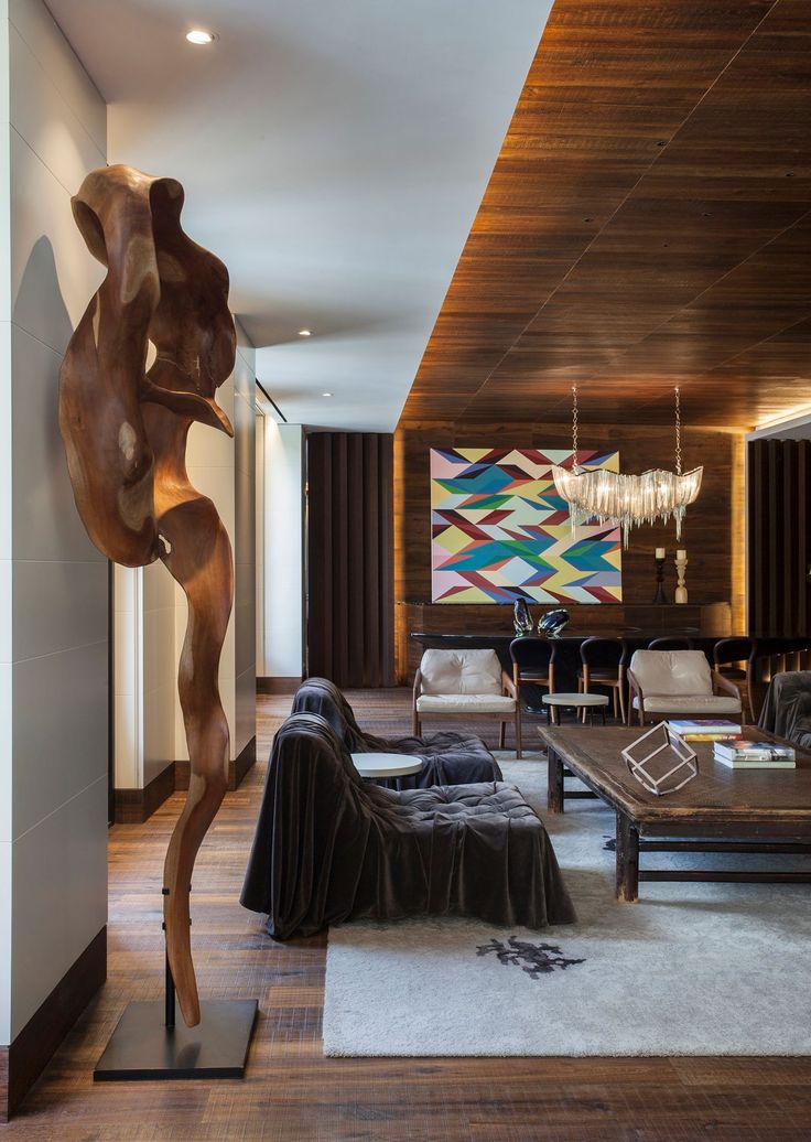 Example: A sculptural dining table can be highlighted with a bold chandelier, making it the focal point of the room.